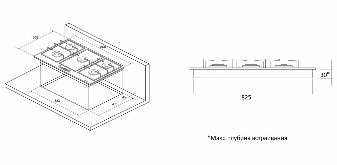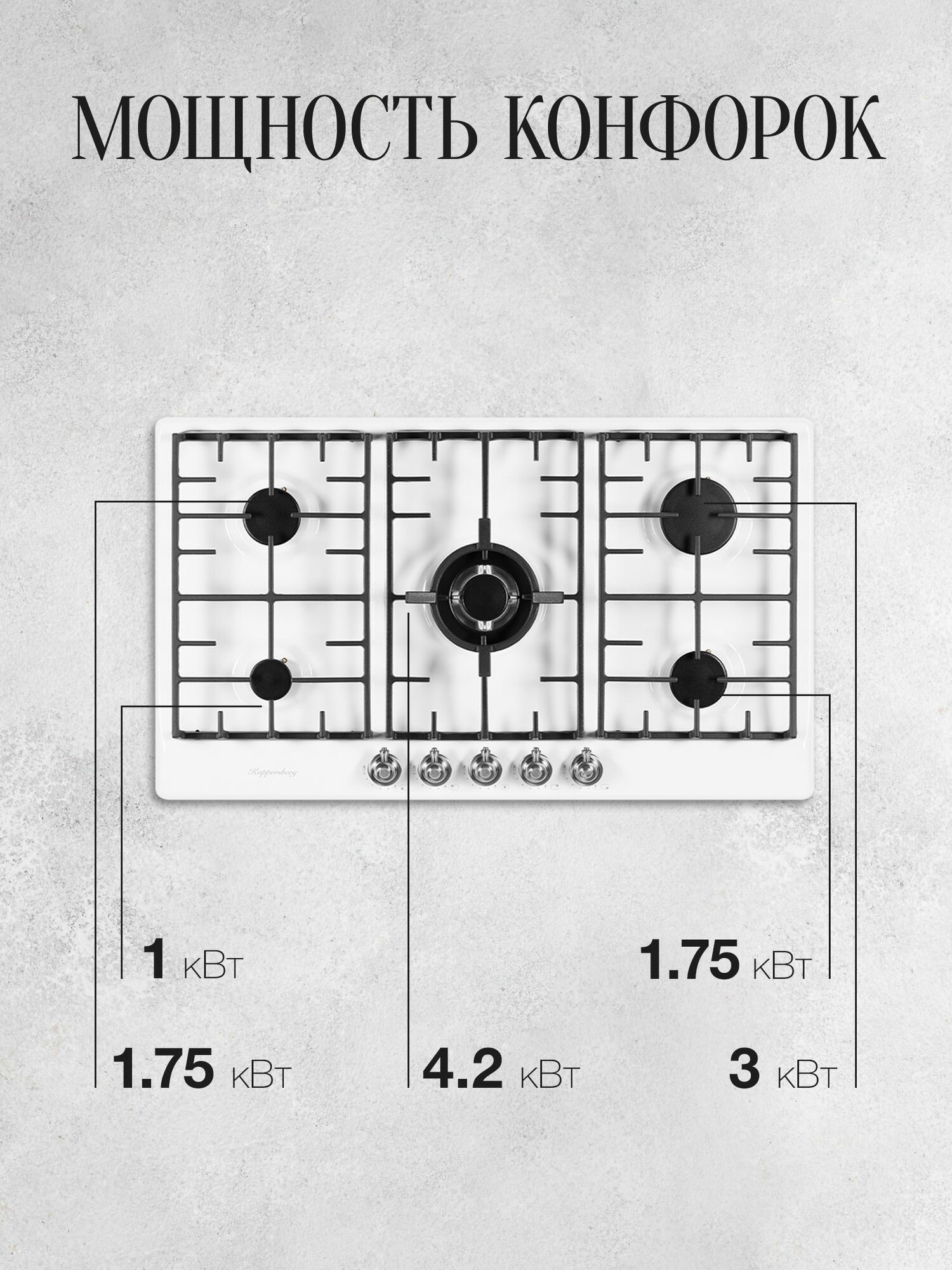 мощность конфорок: передняя левая 1,0 кВт, передняя правая 1,75 кВт, средняя/конфорка WOK 3,6 кВт, задняя левая 1,75 кВт,: задняя правая 3,0 кВт; форсунки под сжиженный газ; держатель для турки; цвет панели антрацит; бронзовый цвет фурнитуры