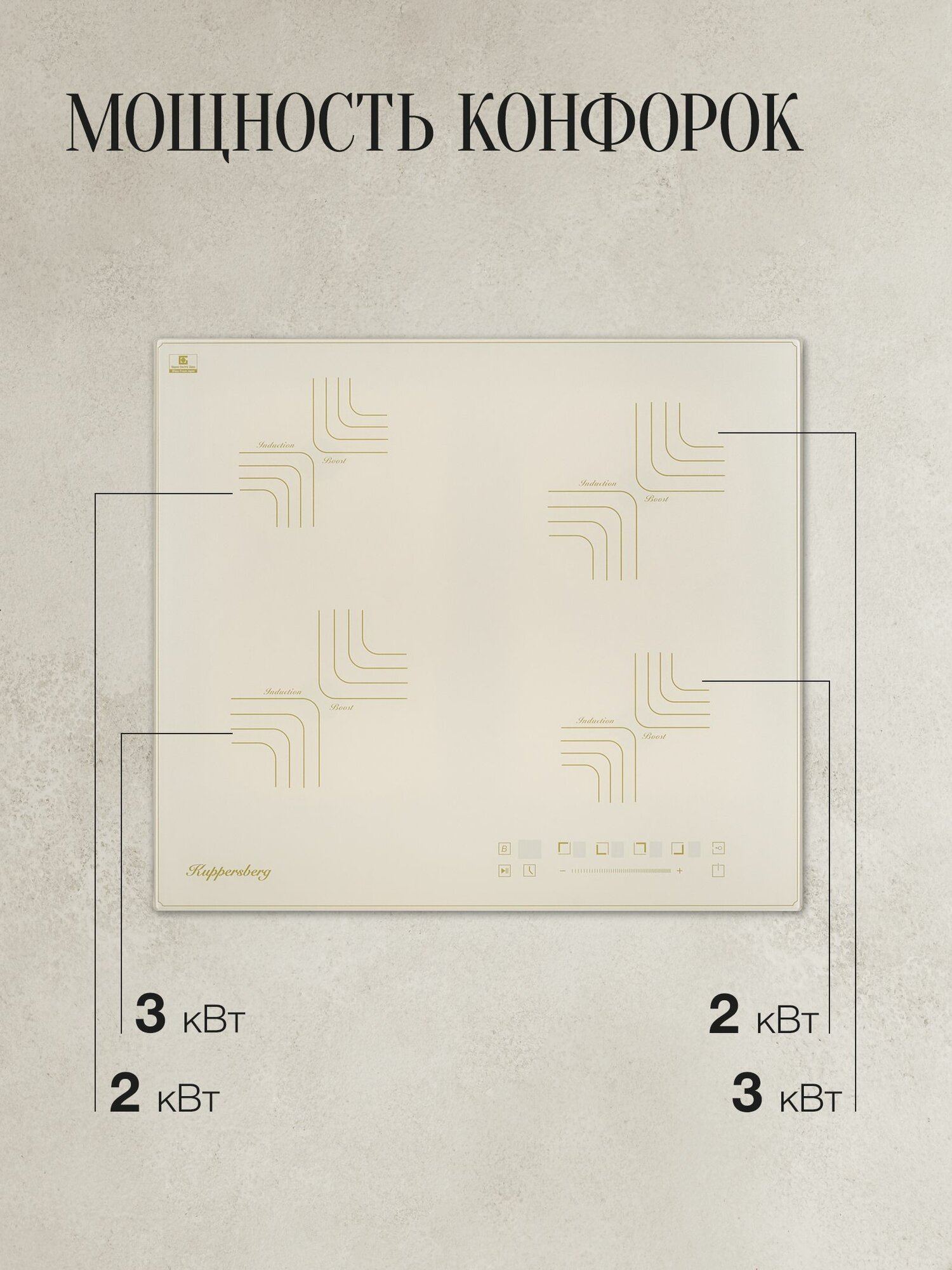 Индукционная плита Kuppersberg ICS 604 C доступна в бежевом цвете. Режим Booster временно увеличивает мощность конфорок, например, позволяя быстро вскипятить воду в кастрюле или нагреть сковороду. Благодаря сенсорному управлению выбор настроек осуществляется легким касанием.