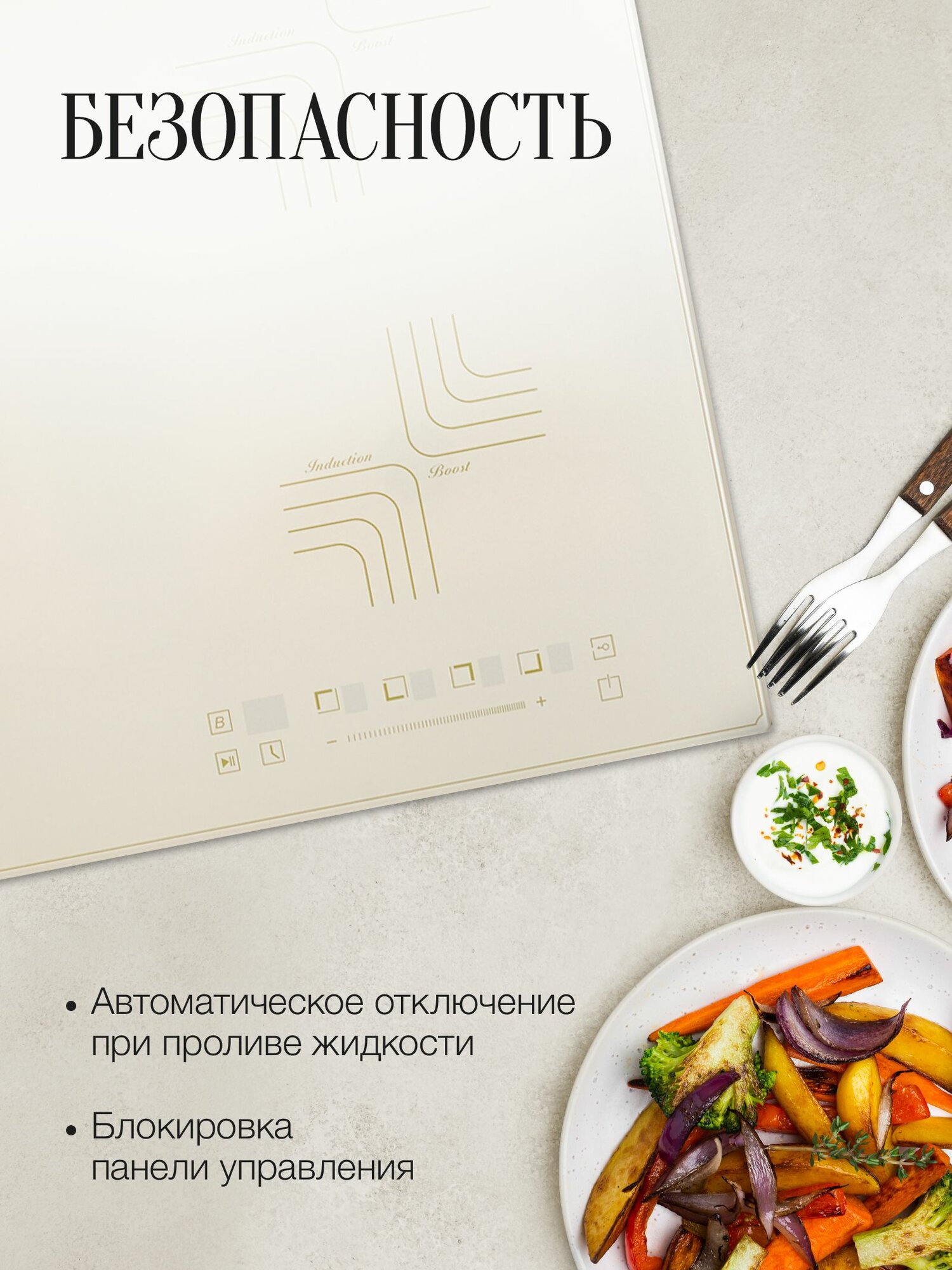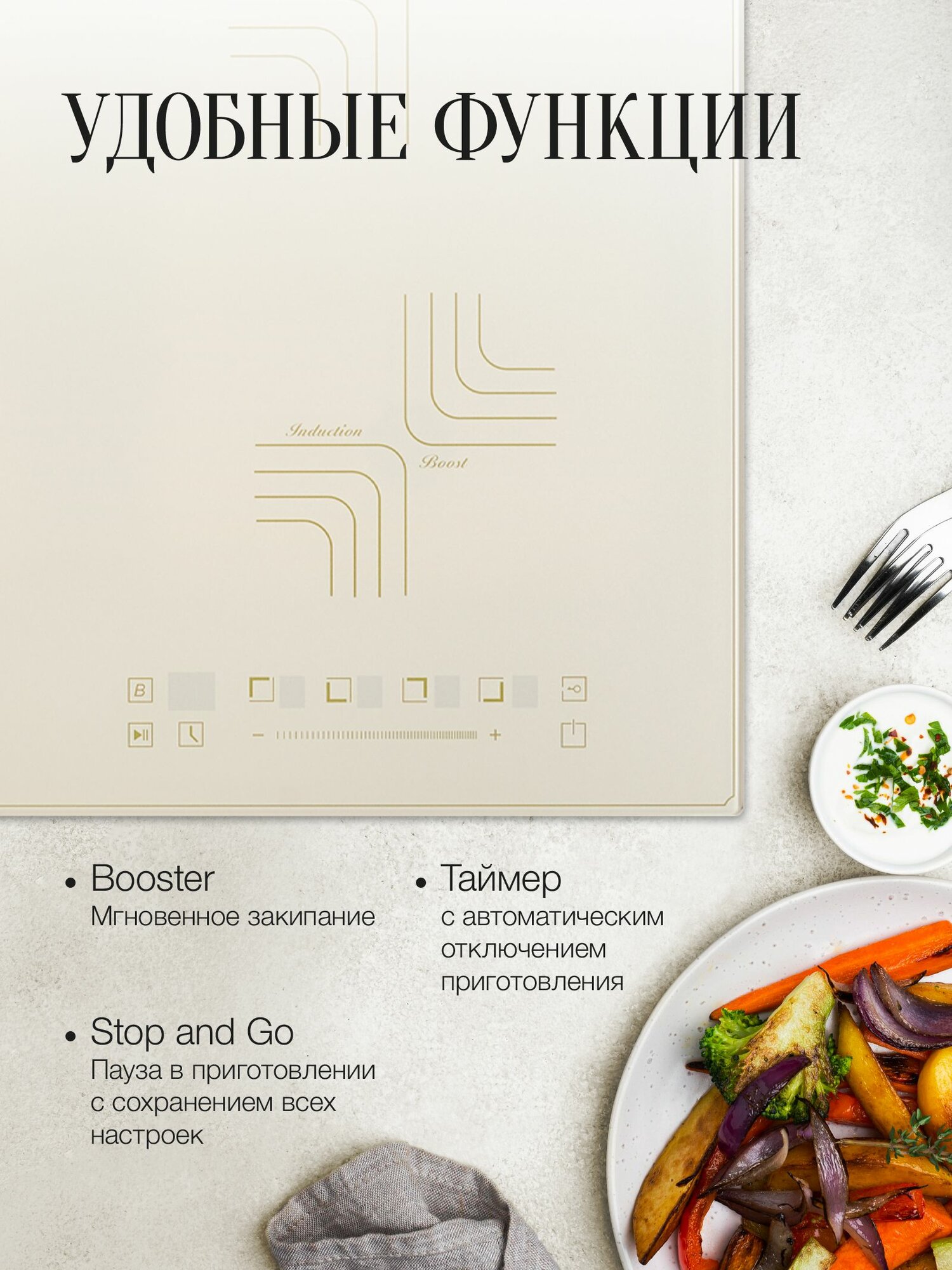 Установка вровень со столешницей; Электронное управление; Самодиагностика неисправности; Функция Stop&Go; Отключение при проливе жидкости; Защита от детей; Индикация выбранной мощности; В комплекте: сетевой кабель с вилкой