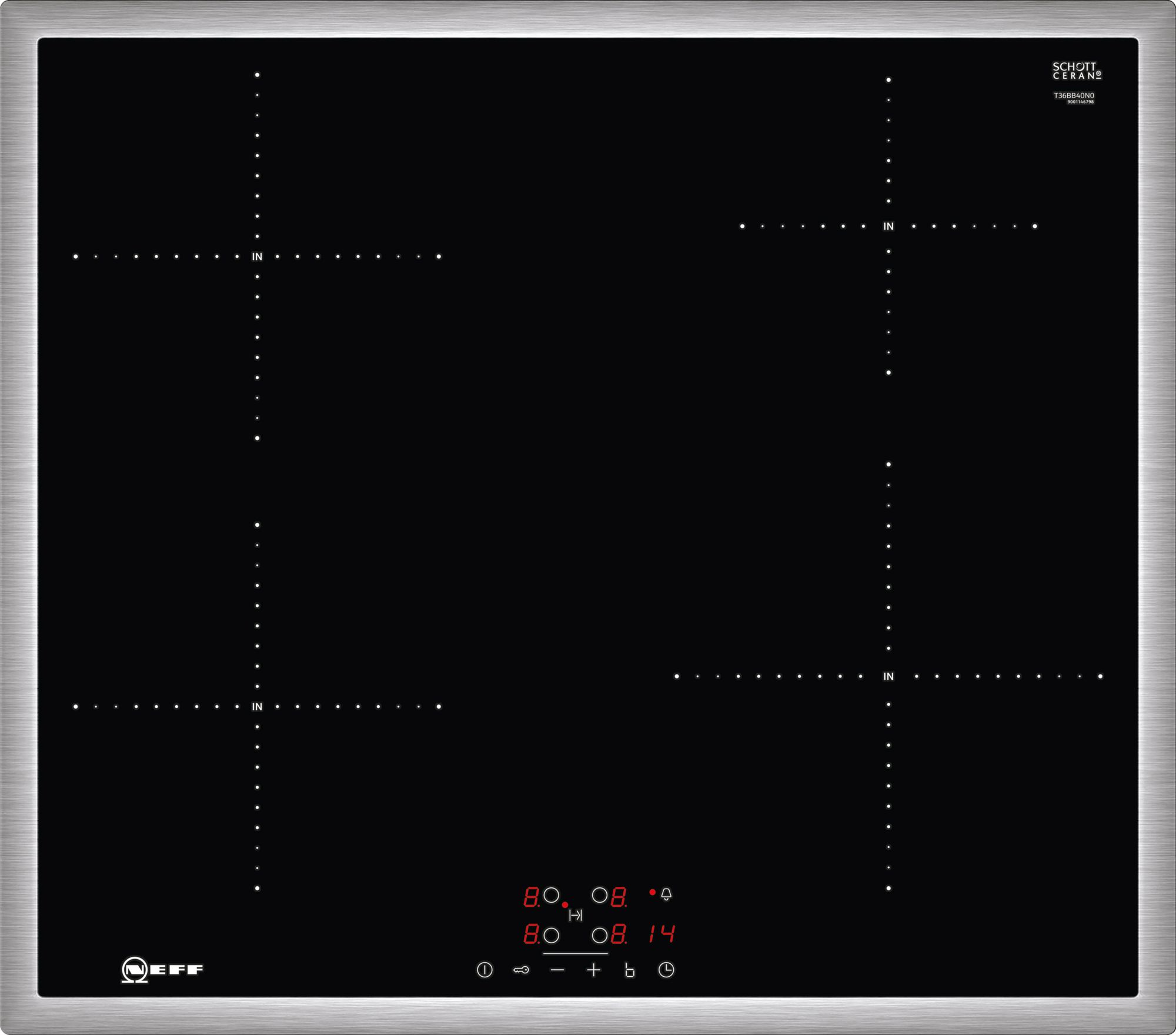 Neff T36BB40N0 – это индукционная варочная встраиваемая панель, оснащённая четырьмя конфорками: двумя среднего размера, одной маленькой и одной самой крупной, подходящей для крупногабаритной посуды, например, больших кастрюль.