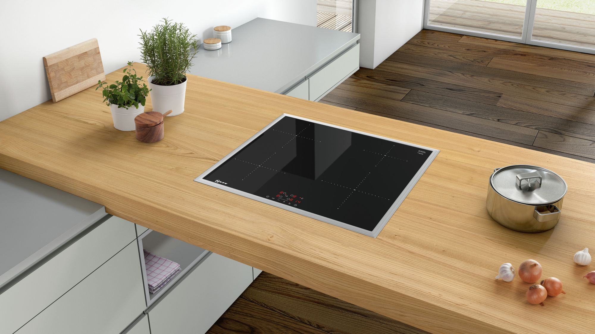 Варочная независимая панель Neff T36BB40N0 легко встраивается в любую столешницу. Дизайн лаконичный и стильный: чёрная стеклокерамика со стальной рамой и простые линии позволяют идеально вписать устройство в любой интерьер. Панель станет достойным дополнением или оригинальным завершающим штрихом стиля кухни.
