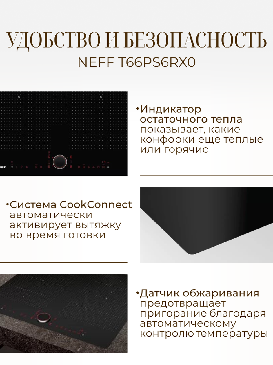 защитное отключение конфорок, индикатор остаточного тепла, кнопка блокировки панели