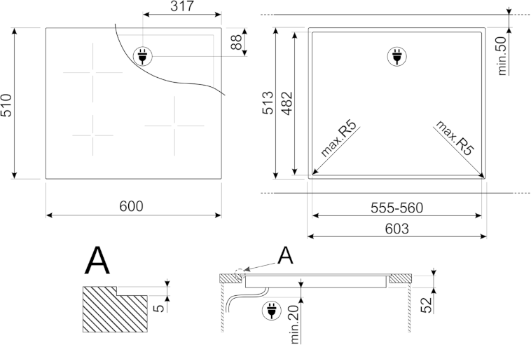 стандартный вырез: 478-482x555-560 мм; уровни мощности: 9; автоматическое определение диаметра посуды; автоматическое определение наличия посуды (минимум 9 см); индикация минимального диаметра посуды; длина электрического кабеля: 120 см