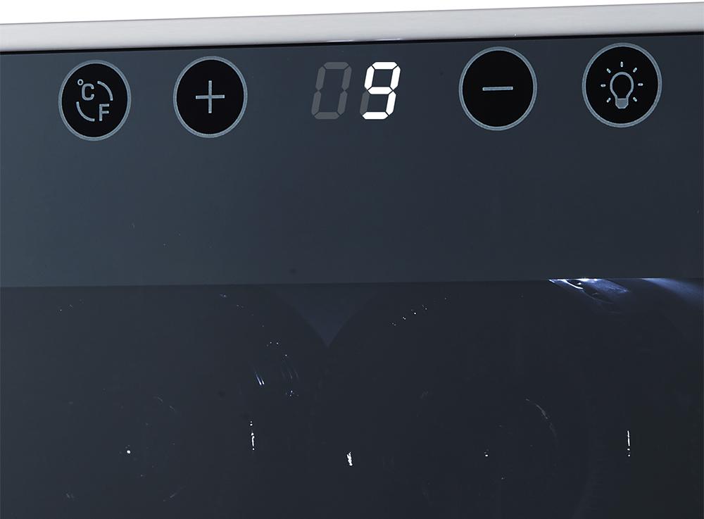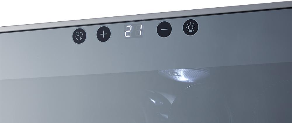 Материал полок: Массив бука Материал корпуса: Металл Индикаторы: Температура, Подсветка Цвет подсветки: Белый Цвет стекла: Зеркальный Петли: Внешние