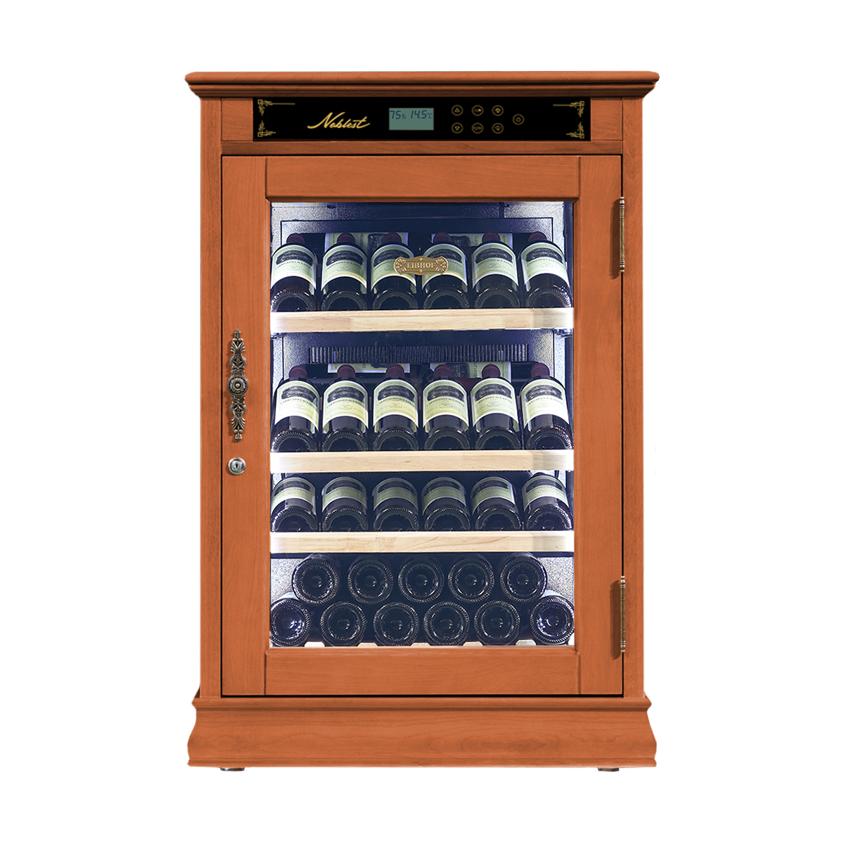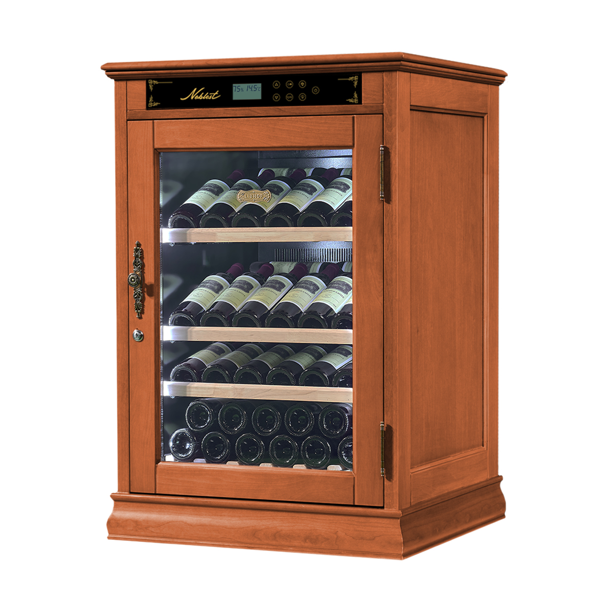 Материал полок: Массив бука Дисплейные полки Материал корпуса: Красная вишня Цвет подсветки: RGB-подсветка Цвет стекла: Прозрачный Память настроек Петли: Внутренние Поддержание оптимальной влажности: активное