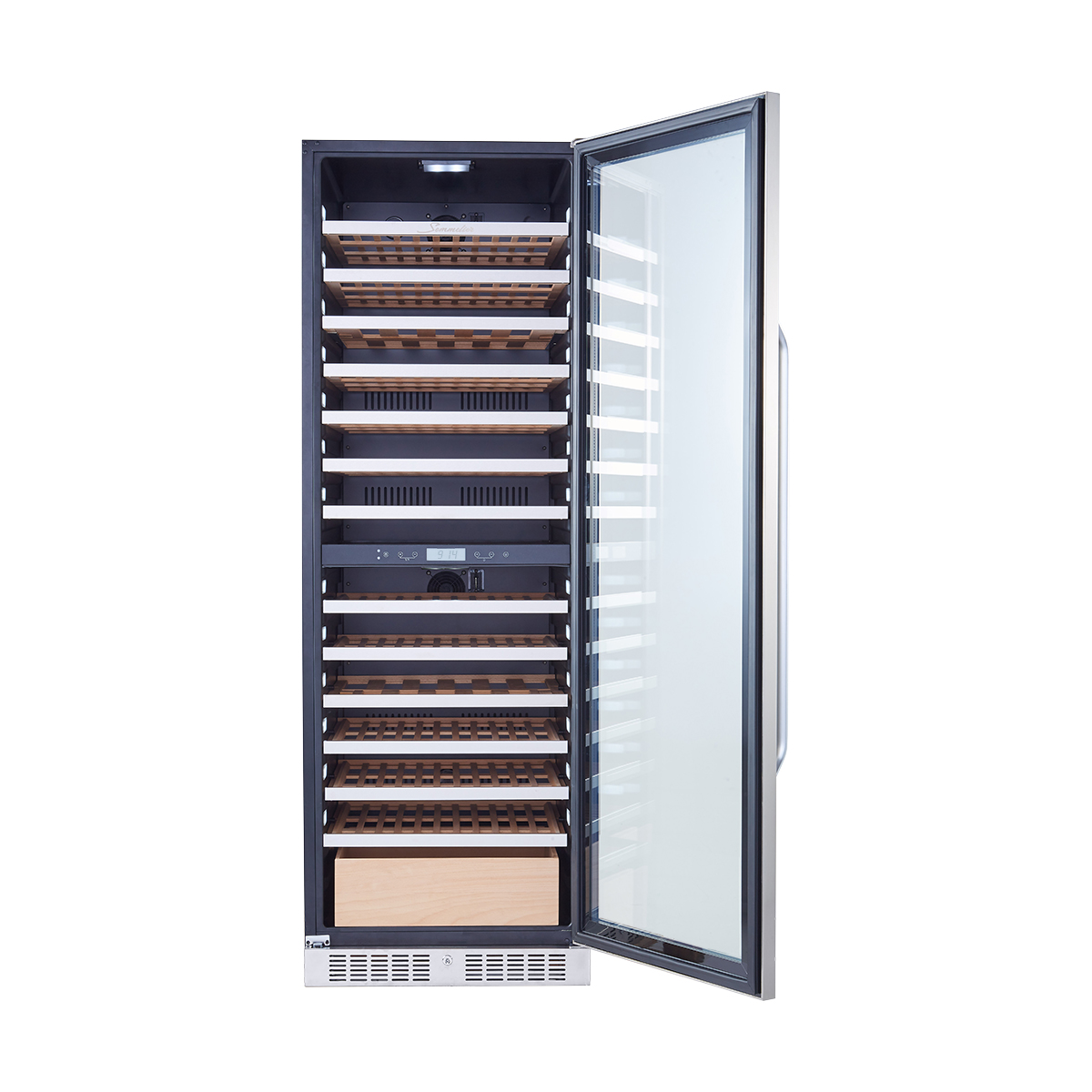 Материал полок: Массив бука Материал корпуса: Металл Индикаторы: Температура, Вентилятор Цвет подсветки: Белый Цвет стекла: Прозрачный Память настроек Поддержание оптимальной влажности: пассивное Петли: Внешние
