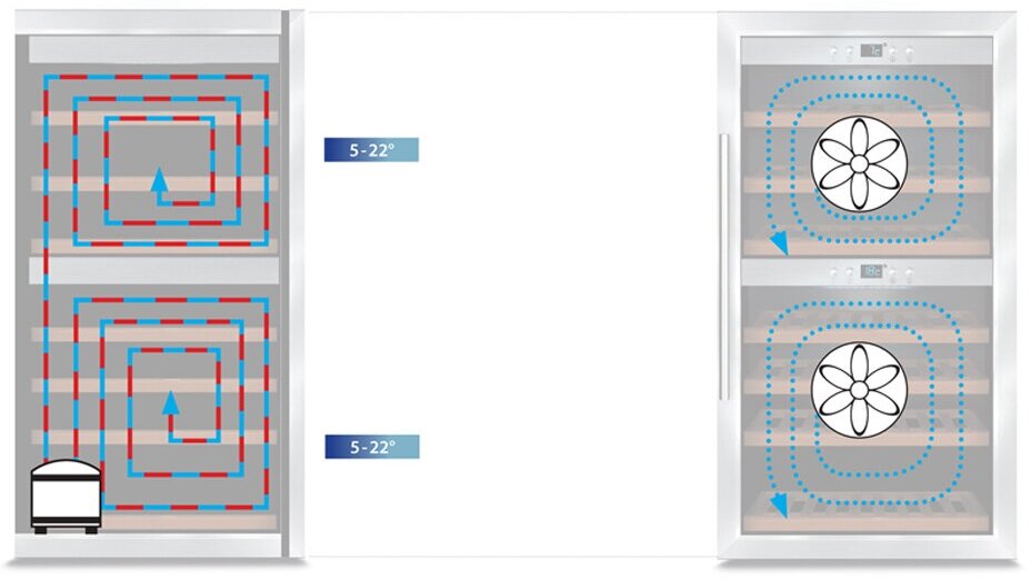 дисплей, перевешиваемые двери, Антивибрационная система, Винная камера, Вправо, Дизайнерское оформление, Открывающиеся вправо, Ручки легкого открывания, Светодиодная подсветка, Система контроля влажности, охлаждение с вентилятором, перенавешиваемые двери