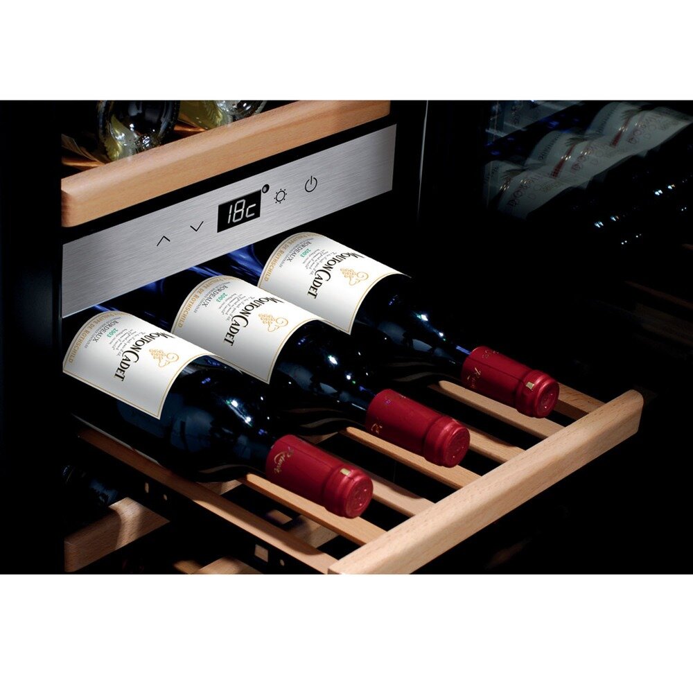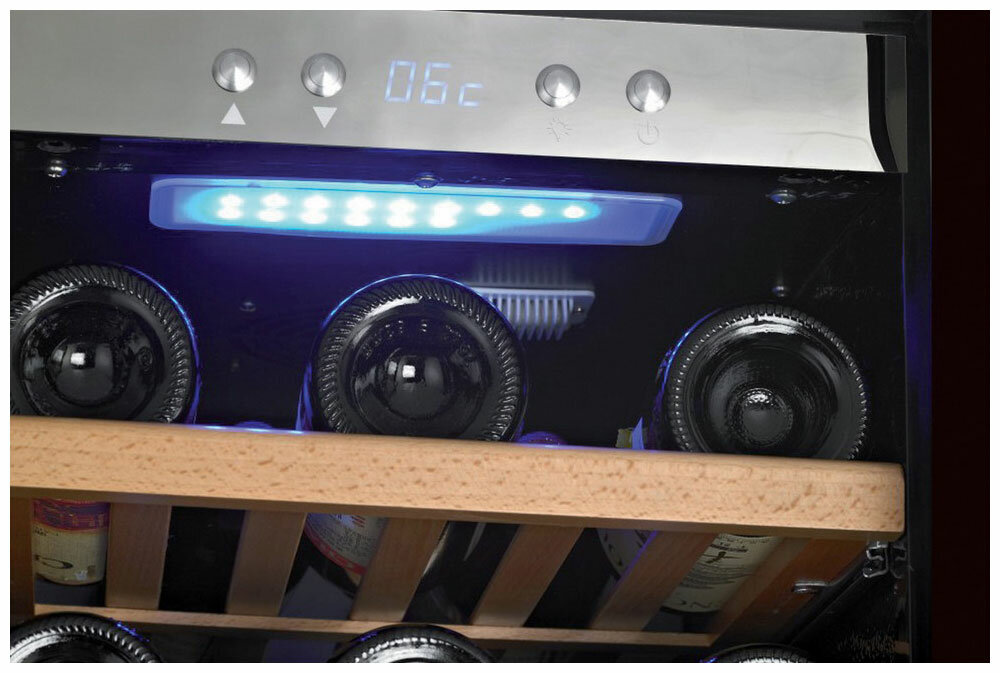 Индикация включения; Встроенный вентилятор для распределения температуры; Дверь с двойным стеклом; Выдвижные полки; Активный вентилятор на каждую зону; Светодиодное (LED) освещение