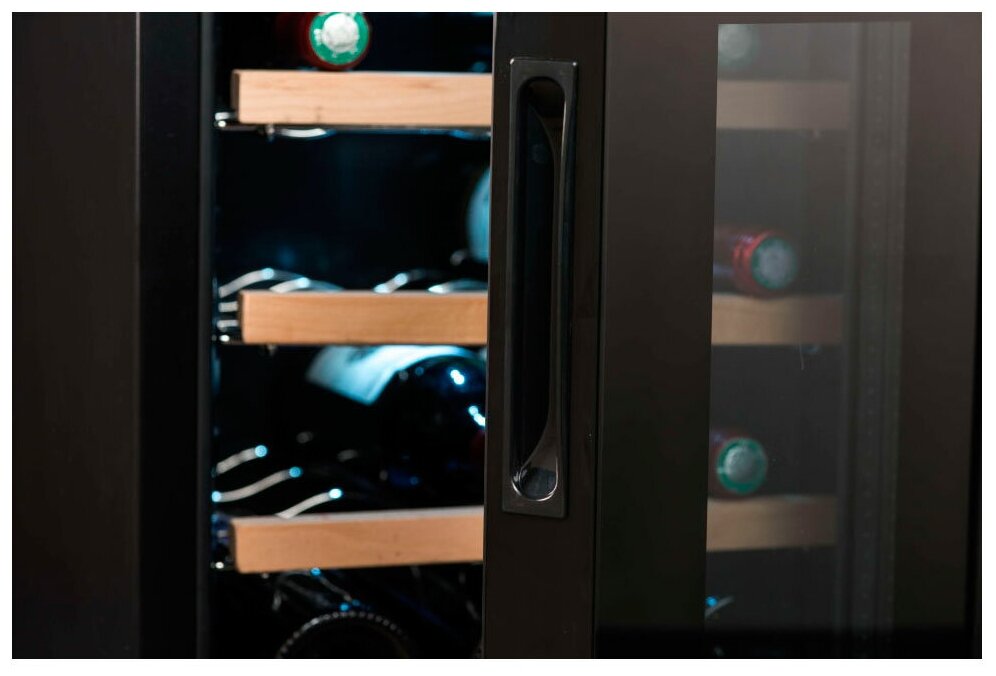 дисплей, Антивибрационная система, Винная камера, Вправо, Дизайнерское оформление, Открывающиеся вправо, Ручки легкого открывания, Светодиодная подсветка, Система контроля влажности, Скрытые ручки