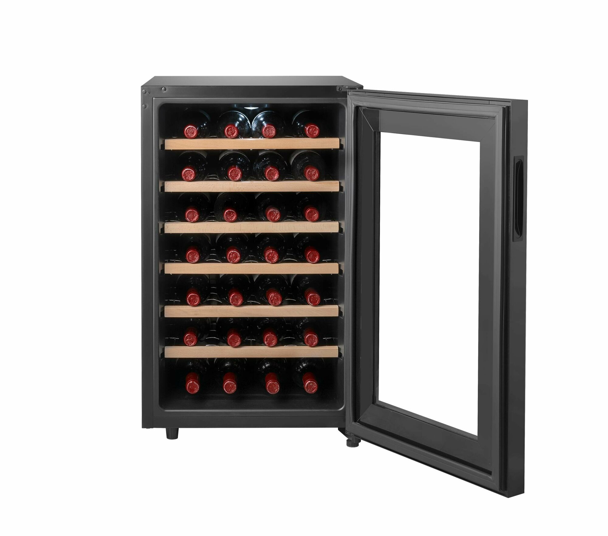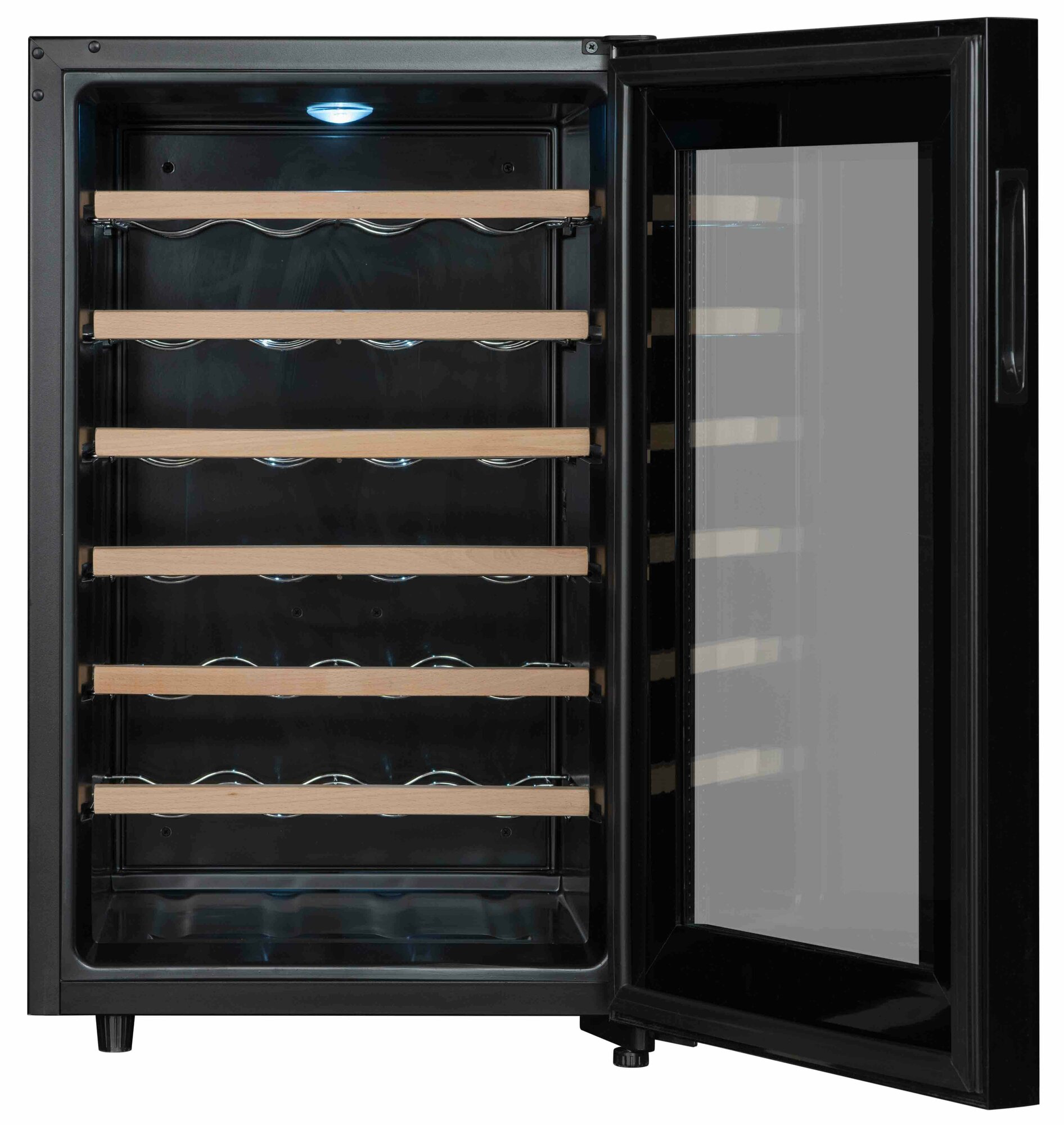 гибридная система охлаждения (компрессор + термоэлектрический элемент) / 6 фиксированных полок с фасадом из натурального дерева