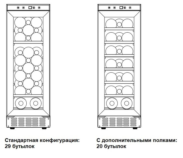 Возможность встраивания: Под столешницу, Функция памяти установленного режима охлаждения (при отключении электропитания заданный режим сохраняется), Индикация температуры, Регулировка высоты за счет выкручивания ножек до 8 см, Задняя стенка винного шкафа абсолютно плоская (можно ставить вплотную к стене), Режим: Тихая работа, Закаленное стекло, Фиксированные усиленные полки для бордосских и бургундских бутылок, Мощность подключения: 85 Вт
