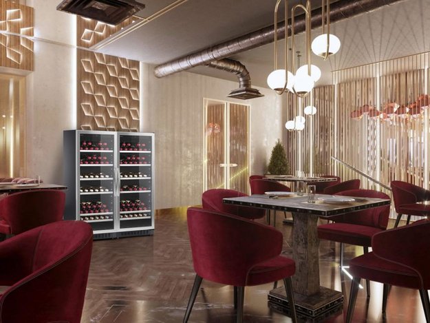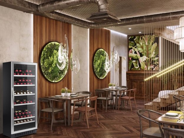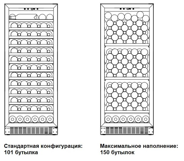 Подходит для ресторана, Возможность встраивания: В колонну, Стандартная комплектация: Резервуар для воды, Индикация температуры, Функция памяти установленного режима охлаждения (при отключении электропитания заданный режим сохраняется), Максимальная закладка до 150 бутылок (при демонтаже нескольких полок), Режим: Тихая работа, Закаленное стекло, Дизайн Silver: передние части полок окрашены под цвет двери, Возможность установки выдвижного ящика для открытых бутылок и крепкого алкоголя, Регулировка высоты за счет выкручивания ножек до 8 см, Задняя стенка ви