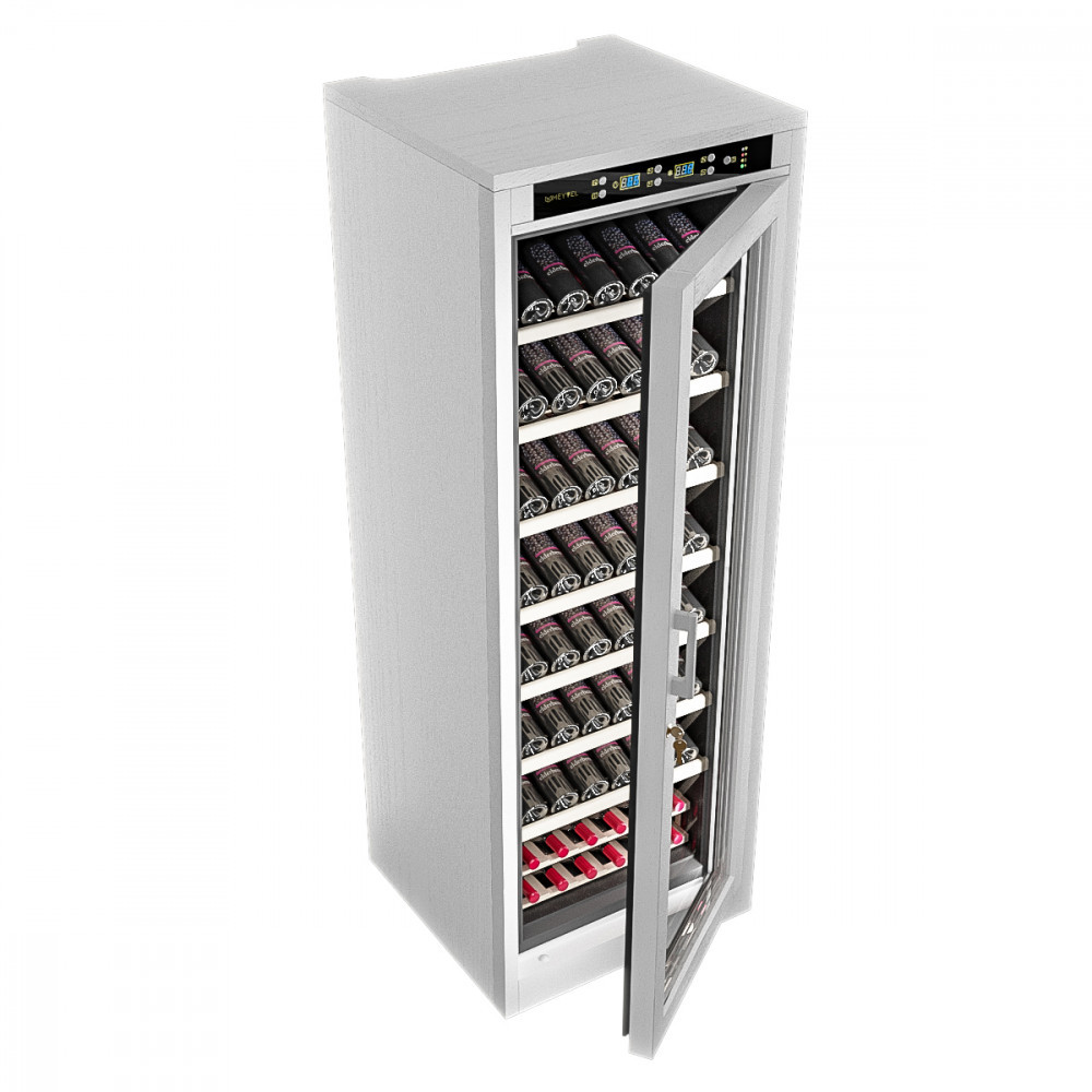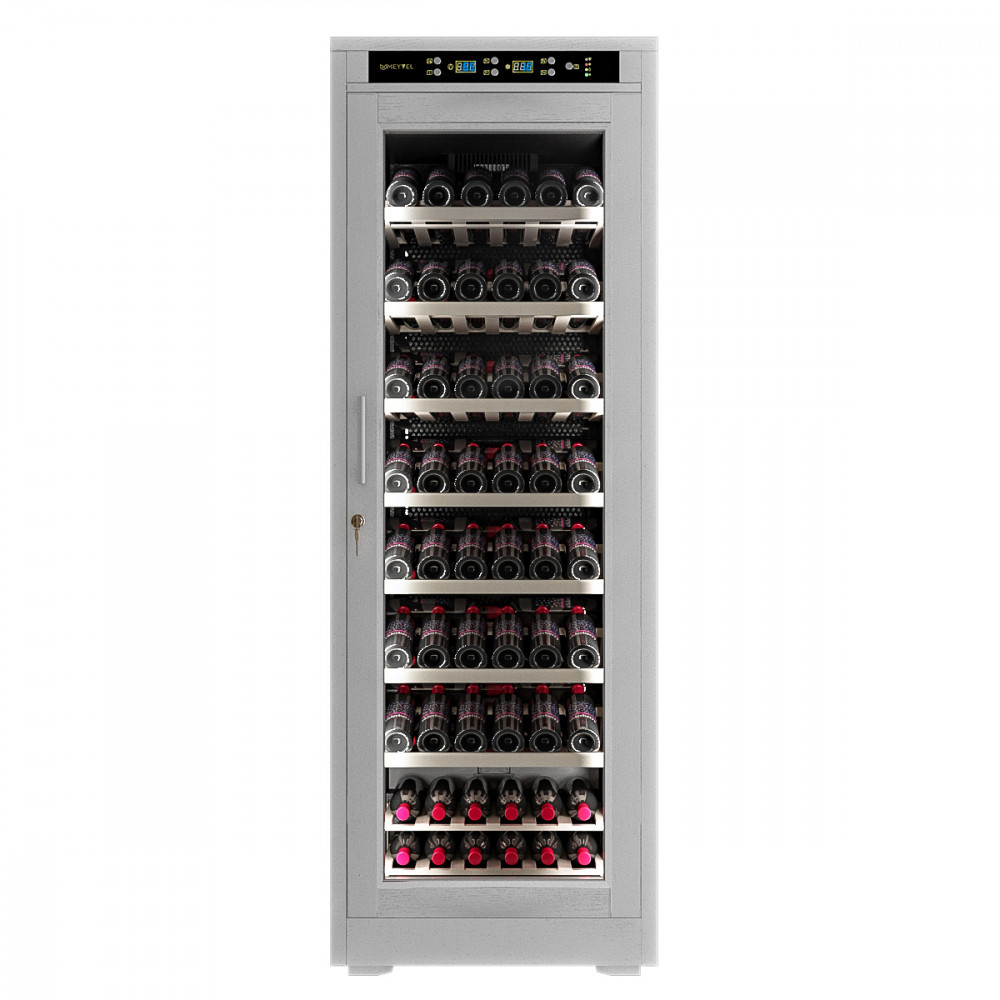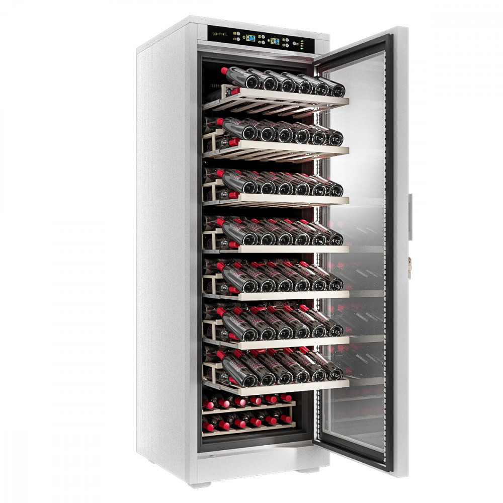 Ручка двери: Чёрная Материал корпуса: Стальной обшитый деревом Панорамное освещение Демонстрационное освещение Тип полок: Стационарная (1) / Демонстрационная (1) Термостат: Электронный Полки: массив бука