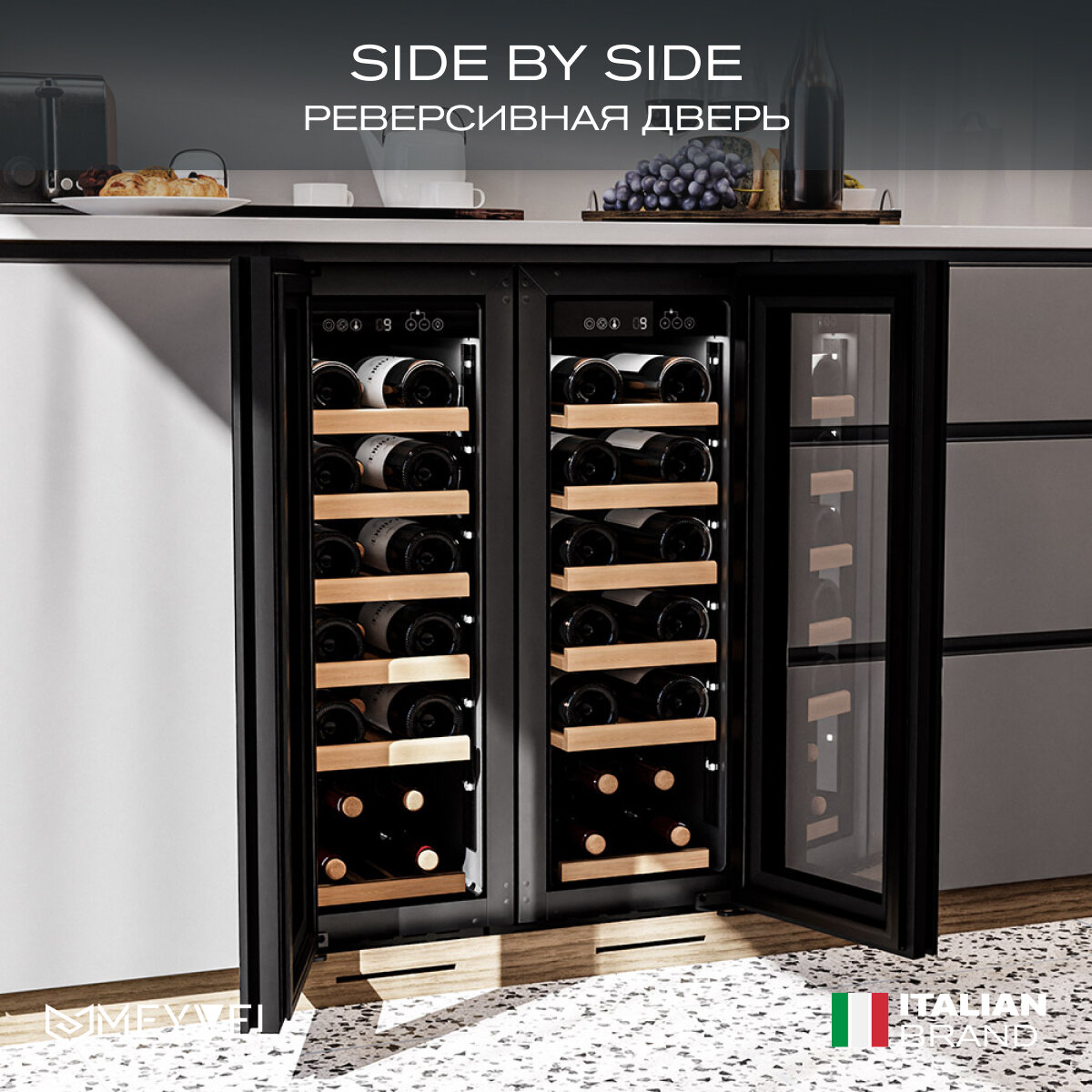 дисплей, перевешиваемые двери, Антивибрационная система, Винная камера, Влево, Вправо, Дизайнерское оформление, Открывающиеся вправо, Ручки легкого открывания, Светодиодная подсветка, Система контроля влажности, Скрытые ручки, автоматическая разморозка