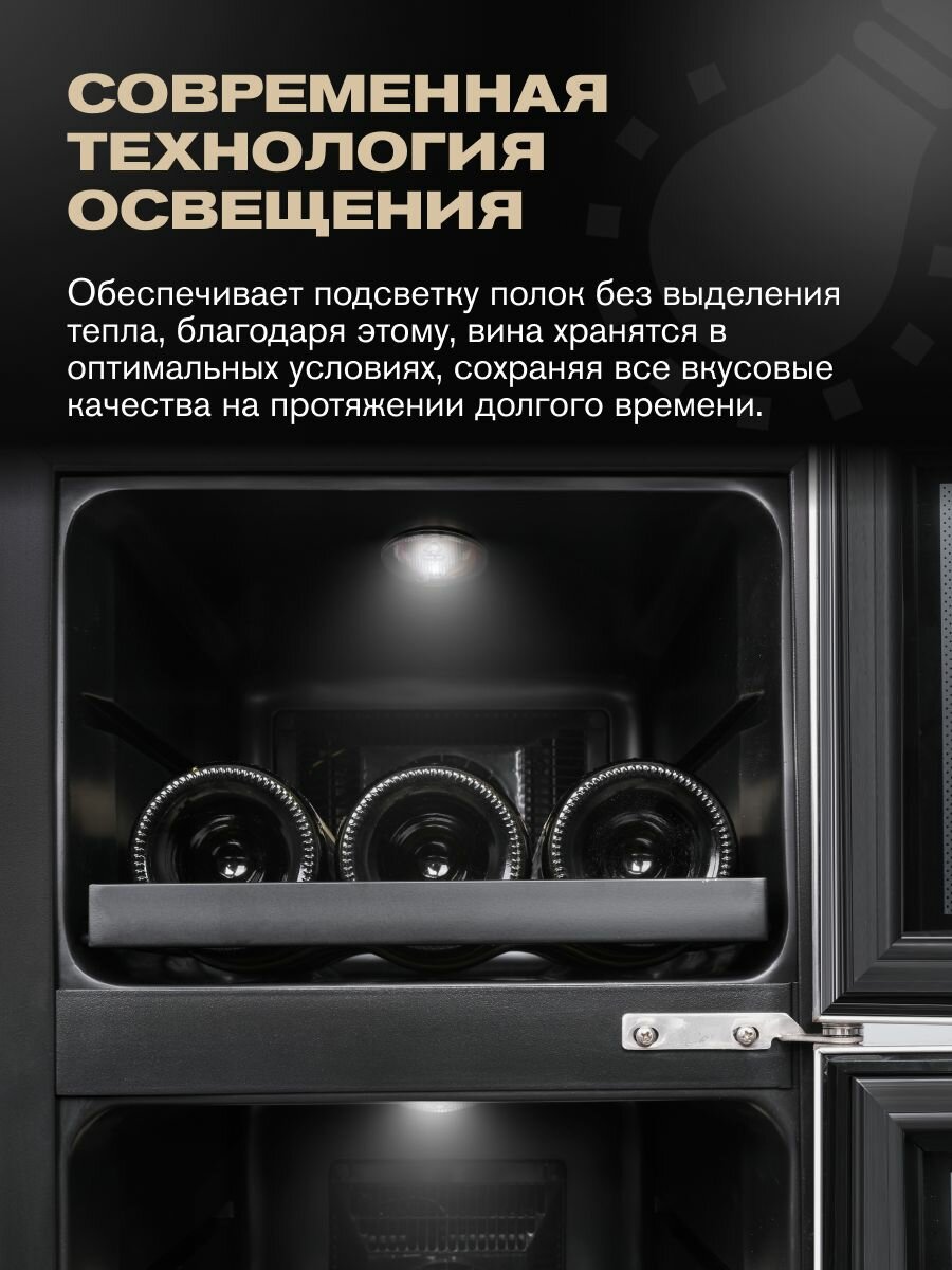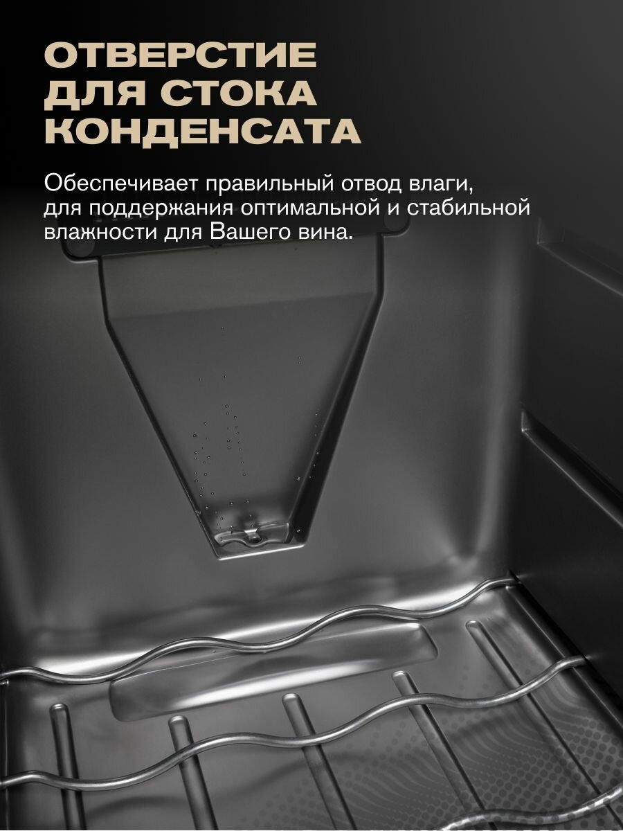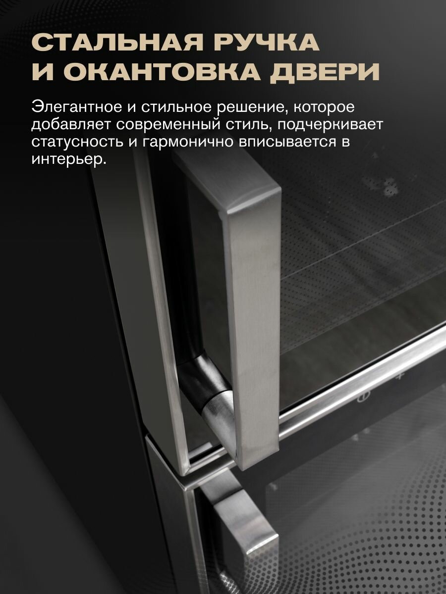 дисплей, Антивибрационная система, Винная камера, Вправо, Дизайнерское оформление, Открывающиеся вправо, Ручки легкого открывания, Светодиодная подсветка, Система контроля влажности
