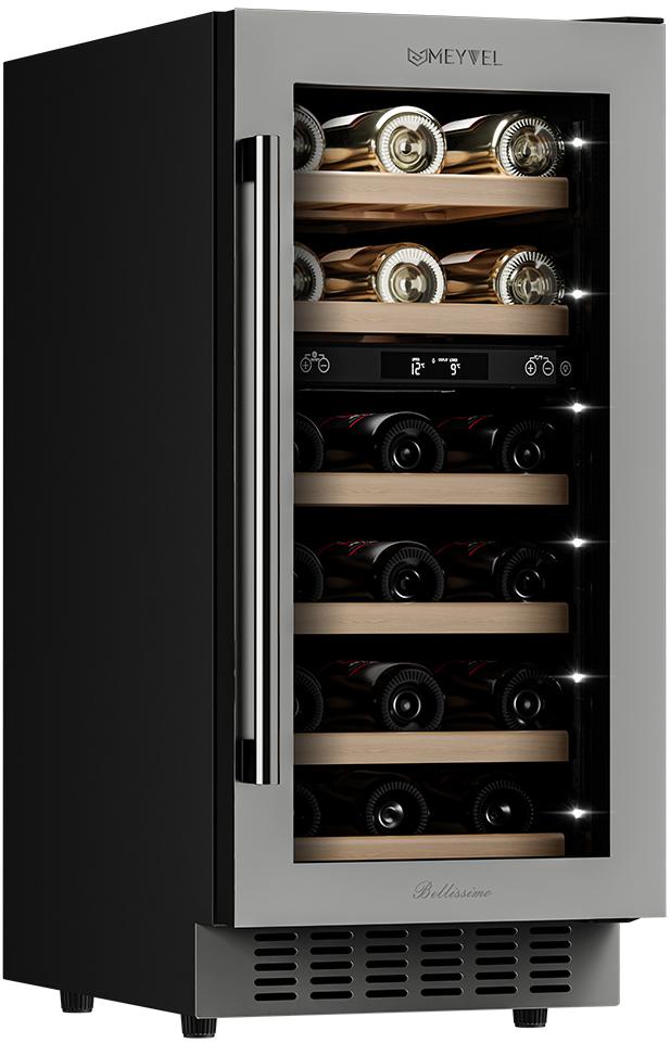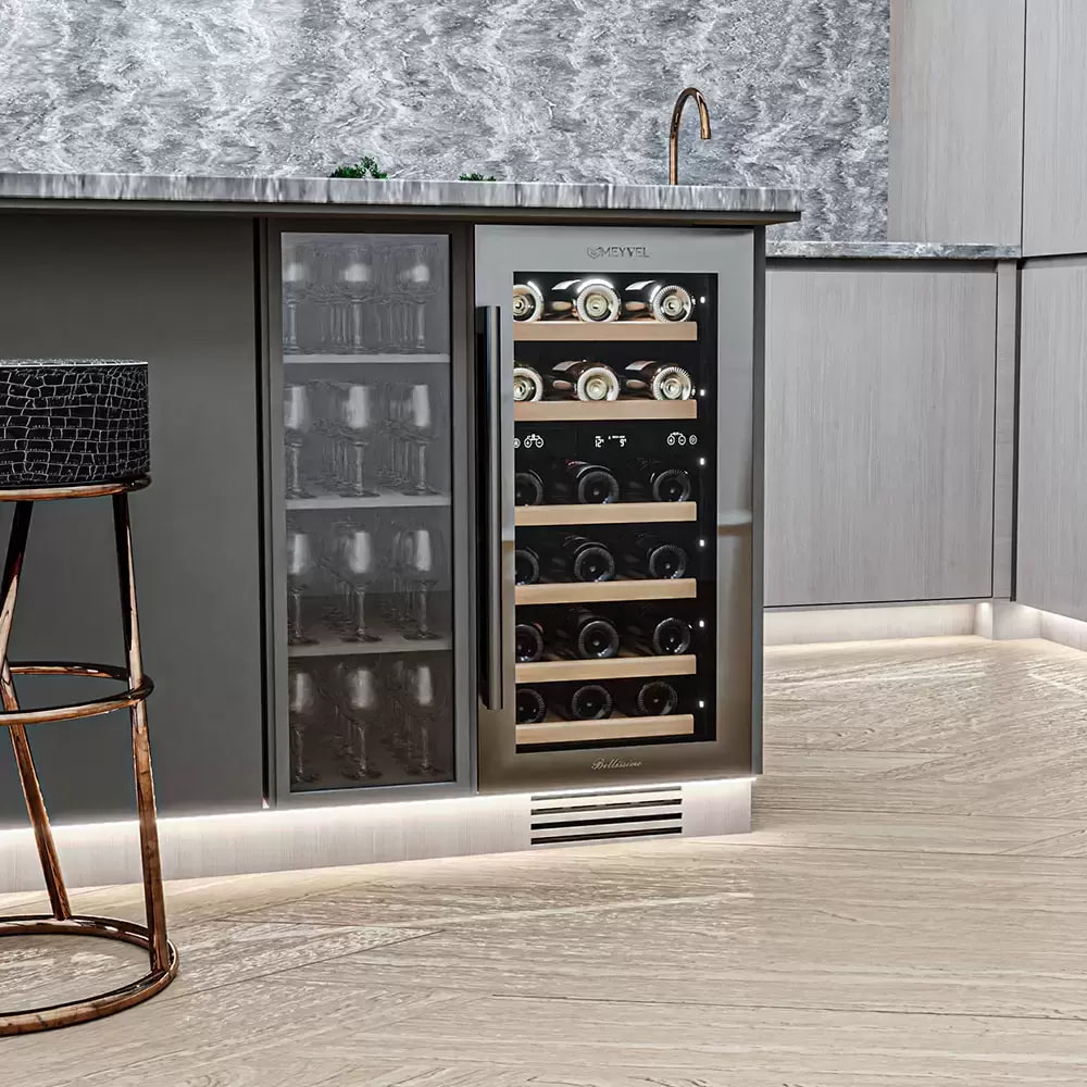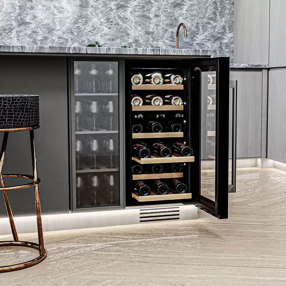 динамическое охлаждение Динамическое охлаждение Динамическая (или вентиляционная) система охлаждения обеспечивает равномерное распределение воздуха вкамере. Благодаря этому нанужном уровне поддерживается нетолько температура, ноивлажность. регулируемые ножки Регулируемые ножки Регулируемые ножки— опция, которой оснащаются винные шкафы любого типа: частично иполностью встраиваемые иотдельно стоящие. Холодильники могут иметь четыре или две ножки изменяемой высоты, которые служат как для выравнивания прибора при установке, так идля изменения его высоты, что особенно важно при частичном встраивании внишу или под столешницу. Для изменения высоты ножку достаточно вывинтить, регулировка может быть как плавной, так инанескольких фиксированных уровнях. Диапазон изменения размера зависит отмодели: максимальное его значение может достигать 7см, аминимальное— 2см.