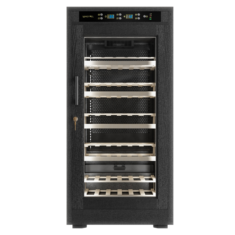 Ручка двери: Чёрная Материал корпуса: Стальной обшитый деревом Панорамное освещение Демонстрационное освещение Тип полок: Стационарная (1) / Демонстрационная (1) Термостат: Электронный Полки: массив бука