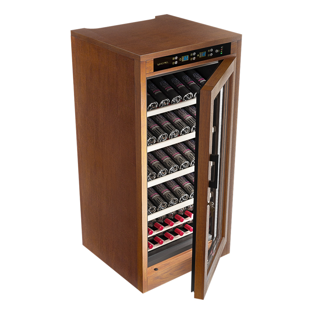 Ручка двери: Чёрная Материал корпуса: Стальной обшитый деревом Панорамное освещение Демонстрационное освещение Тип полок: Стационарная (1) / Демонстрационная (1) Термостат: Электронный Полки: массив бука