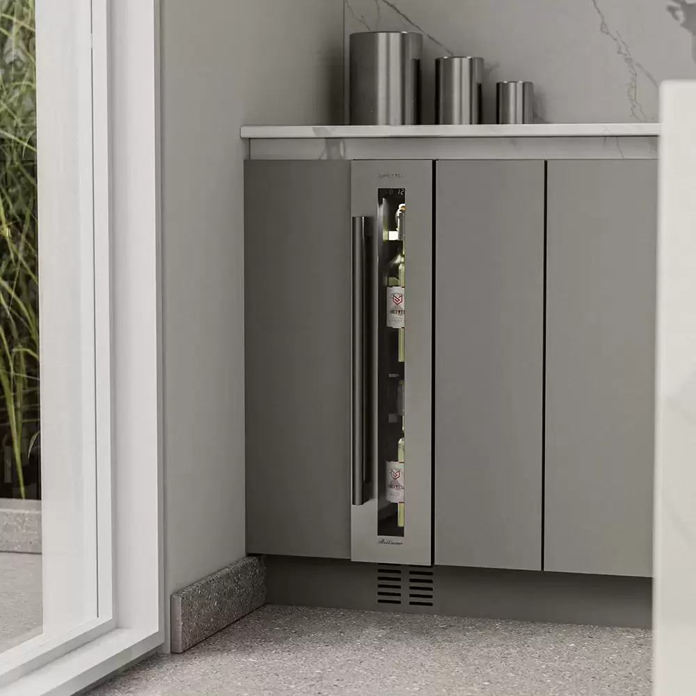 динамическое охлаждение Динамическое охлаждение Динамическая (или вентиляционная) система охлаждения обеспечивает равномерное распределение воздуха вкамере. Благодаря этому нанужном уровне поддерживается нетолько температура, ноивлажность. регулируемые ножки Регулируемые ножки Регулируемые ножки— опция, которой оснащаются винные шкафы любого типа: частично иполностью встраиваемые иотдельно стоящие. Холодильники могут иметь четыре или две ножки изменяемой высоты, которые служат как для выравнивания прибора при установке, так идля изменения его высоты, что особенно важно при частичном встраивании внишу или под столешницу. Для изменения высоты ножку достаточно вывинтить, регулировка может быть как плавной, так инанескольких фиксированных уровнях. Диапазон изменения размера зависит отмодели: максимальное его значение может достигать 7см, аминимальное— 2см.