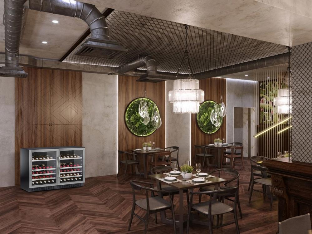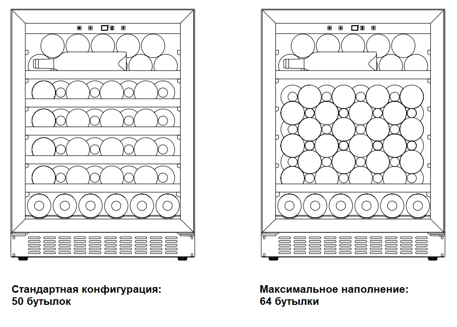 Подходит для ресторана Возможность встраивания: Под столешницу Индикация температуры Настраиваемый по высоте цоколь Дизайн Silver: передние части полок окрашены под цвет двери Режим: Тихая работа Закаленное стекло Максимальная закладка до 64 бутылок (при демонтаже нескольких полок) Функция памяти установленного режима охлаждения (при отключении электропитания заданный режим сохраняется) Регулировка высоты за счет выкручивания ножек до 8 см Задняя стенка винного шкафа абсолютно плоская (можно ставить вплотную к стене) Мощность подключения: 100 Вт