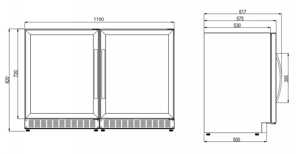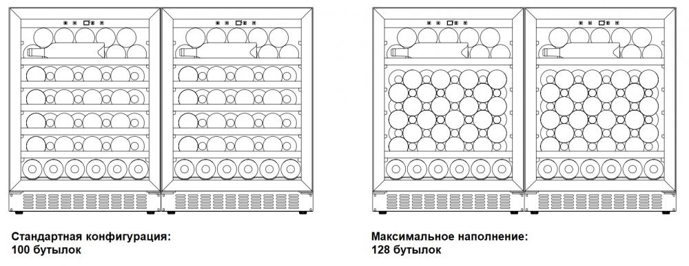 Подходит для ресторана Возможность встраивания: Под столешницу Левая зона: от 5°C до 20°C Правая зона: от 5°C до 20°C Стандартная комплектация: 2 резервуара для воды Индикация температуры Дизайн Silver: передние части полок окрашены под цвет двери Функция памяти установленного режима охлаждения (при отключении электропитания заданный режим сохраняется) Режим: Тихая работа Закаленное стекло Максимальная закладка до 128 бутылок (при демонтаже нескольких полок) Настраиваемый по высоте цоколь Регулировка высоты за счет выкручивания ножек до 8 см Задняя стенка винного шкафа абсолютно плоская (можно ставить вплотную к стене) Мощность подключения: 200 Вт