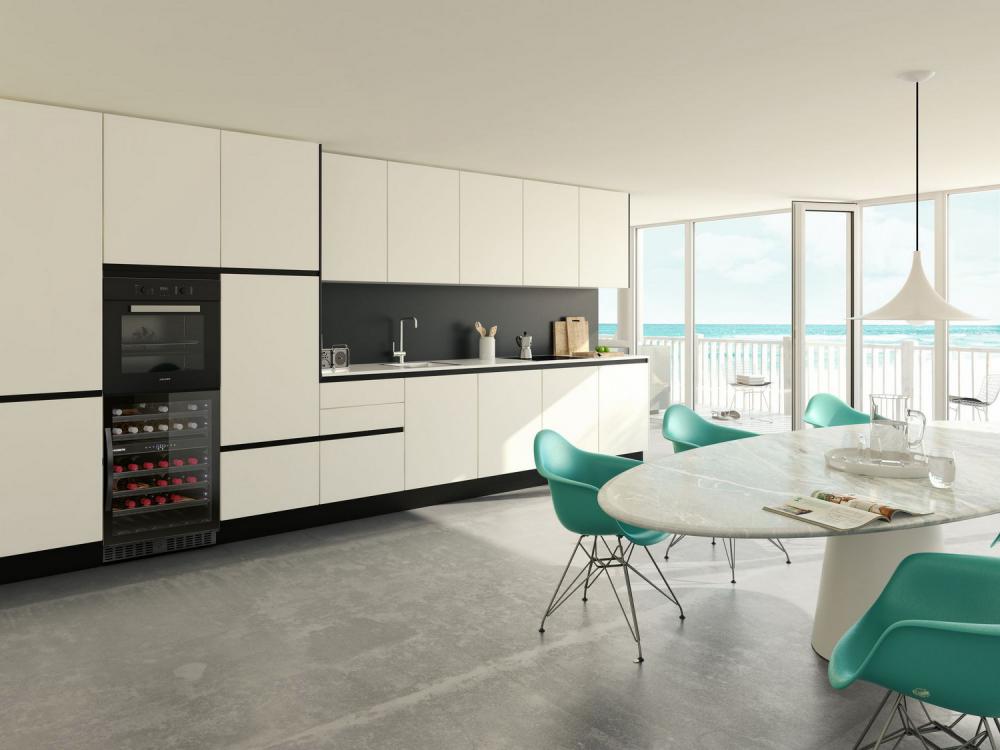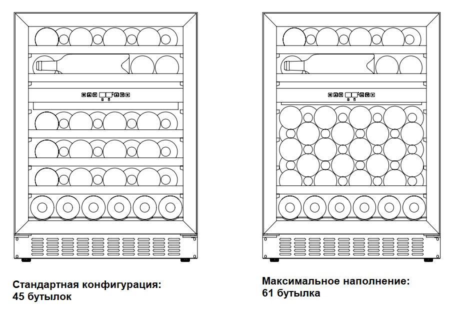 Подходит для ресторана Возможность встраивания: Под столешницу Индикация температуры Размещение бутылок: верхняя зона 15 бут., нижняя зона 30 бут. Режим: Тихая работа Закаленное стекло Максимальная закладка до 61 бутылки (при демонтаже нескольких полок) Дизайн Black: передние части полок окрашены под цвет дверей Функция памяти установленного режима охлаждения (при отключении электропитания заданный режим сохраняется) Настраиваемый по высоте цоколь Регулировка высоты за счет выкручивания ножек до 8 см Задняя стенка винного шкафа абсолютно плоская (можно ставить вплотную к стене) Мощность подключения: 100 Вт Стандартная комплектация: 2 ключа, ярлыки для записей даты закладки вина
