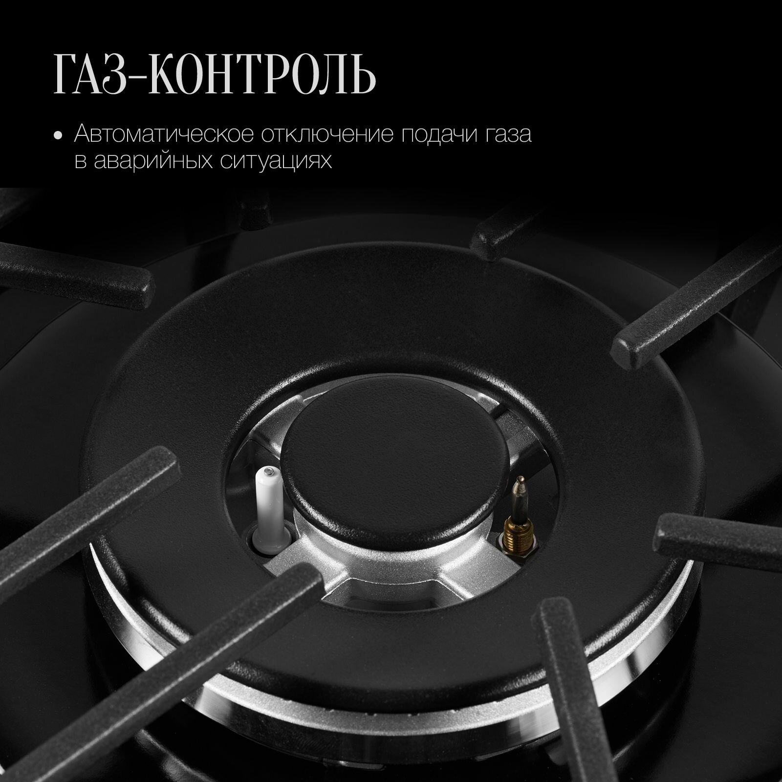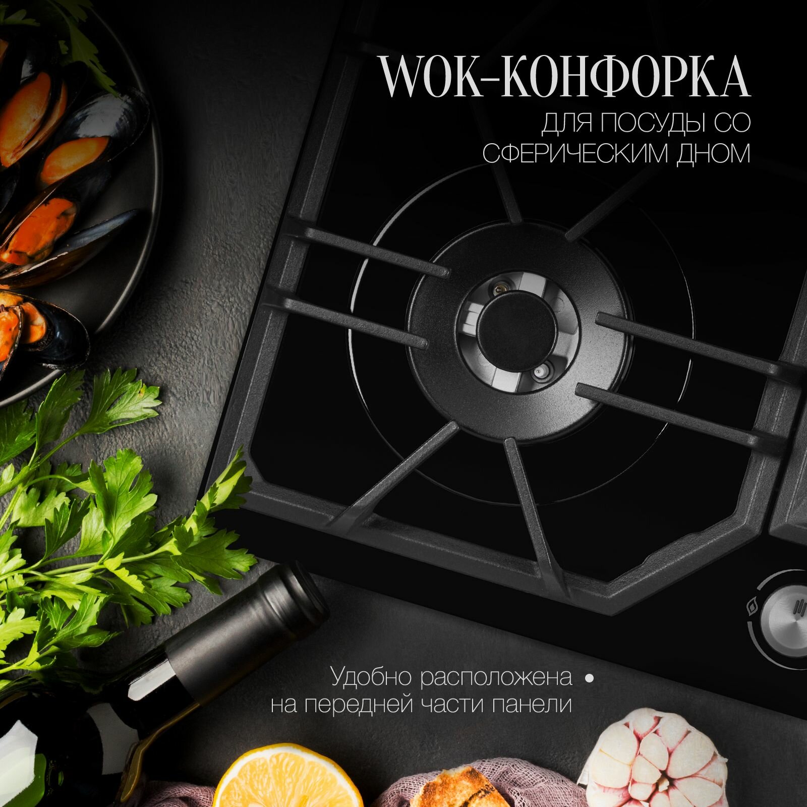 чугунные решетки, газ-контроль, конфорка WOK, электроподжиг в поворотной ручке, электроподжиг в ручке (автоматический)