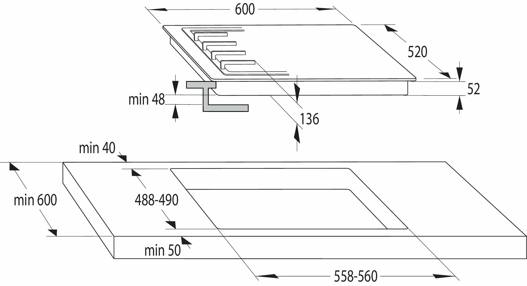 Установка вровень со столешницей; В комплекте: сетевой кабель без вилки, жиклеры для подключения газового баллона, штуцер для подключения газового баллона
