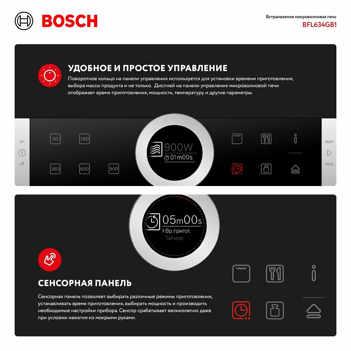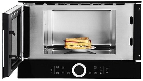 встроенные часы; сенсорное открывание двери; защитное покрытие от отпечатков пальцев; размеры ниши для встраивания (ВхШхГ): 362 мм - 382 мм x 560 мм - 568 мм x 300 мм; потребляемая мощность - 1220 Вт; количество режимов авторазморозки: 3; 5 ступеней мощности: 900, 600, 360, 180 и 90 Вт; подсветка кнопок