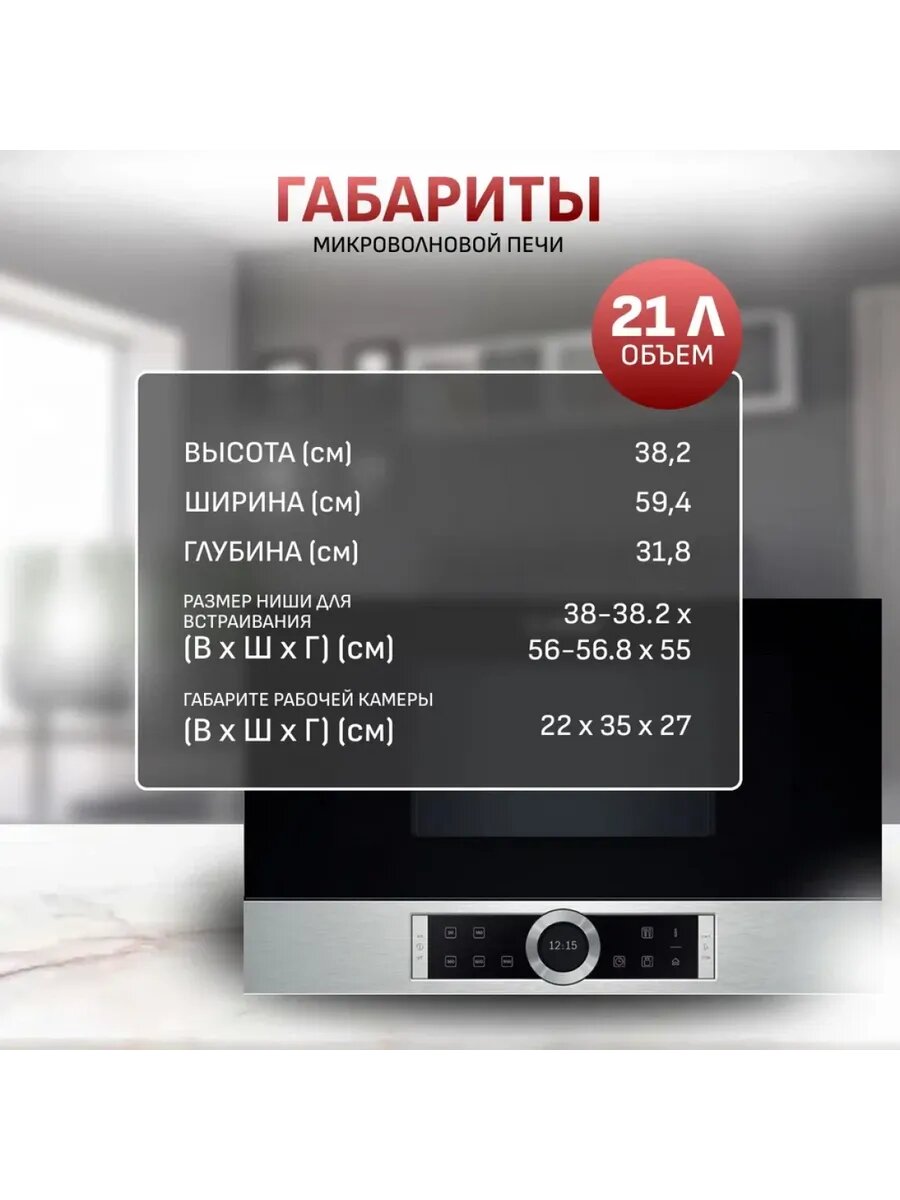 встроенные часы; сенсорное открывание двери; защитное покрытие от отпечатков пальцев; размеры ниши для встраивания (ВхШхГ): 362 мм - 382 мм x 560 мм - 568 мм x 300 мм; потребляемая мощность - 1220 Вт; количество режимов авторазморозки: 3; 5 ступеней мощности: 900, 600, 360, 180 и 90 Вт; подсветка кнопок