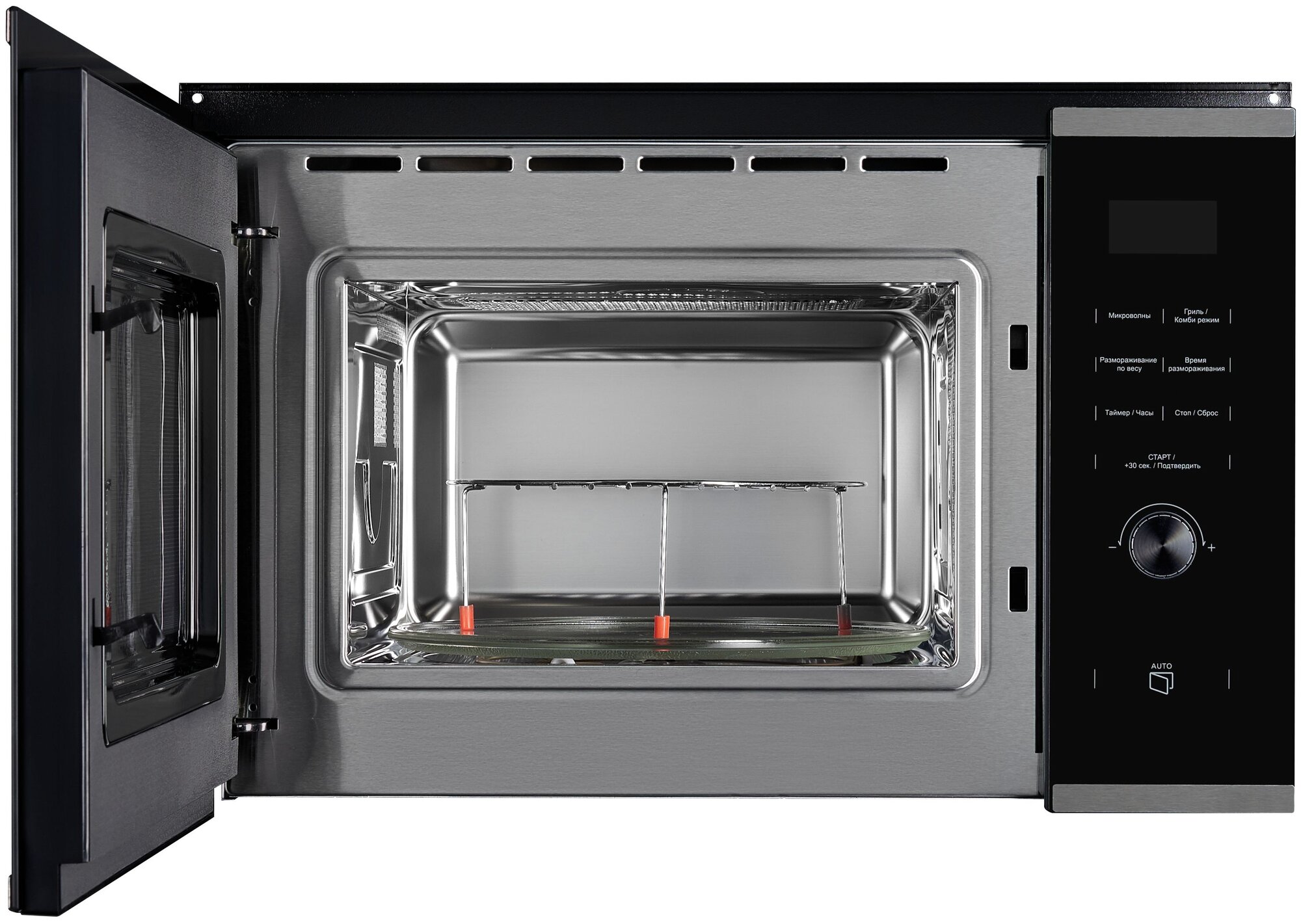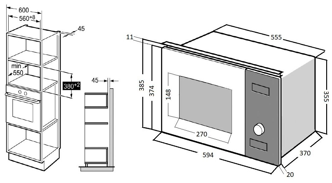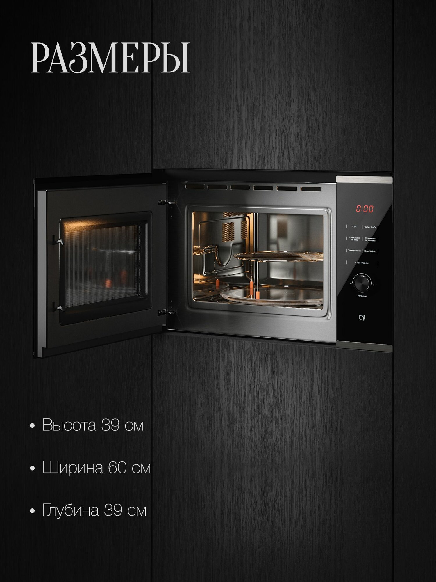 габариты ниши для встраивания (В х Ш х Г), см 38 х 56 х 57; поворотный стол 315 мм, решетка для гриля в комплекте; часы; коллекция: Hi-Tech; таймер многофункциональный; блокировка от детей; мощность подключения: 1450 Вт; размораживание по весу / времени; материал фасада стеклянный, мощность микроволн, Вт 160−900, фурнитура серебристая, комби-режимы