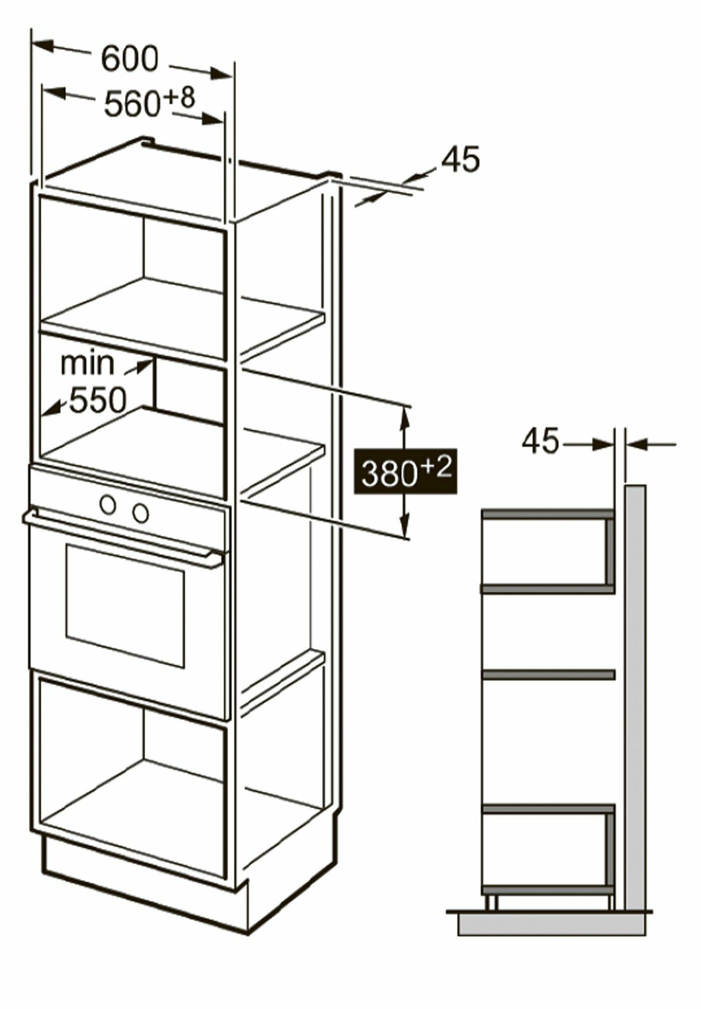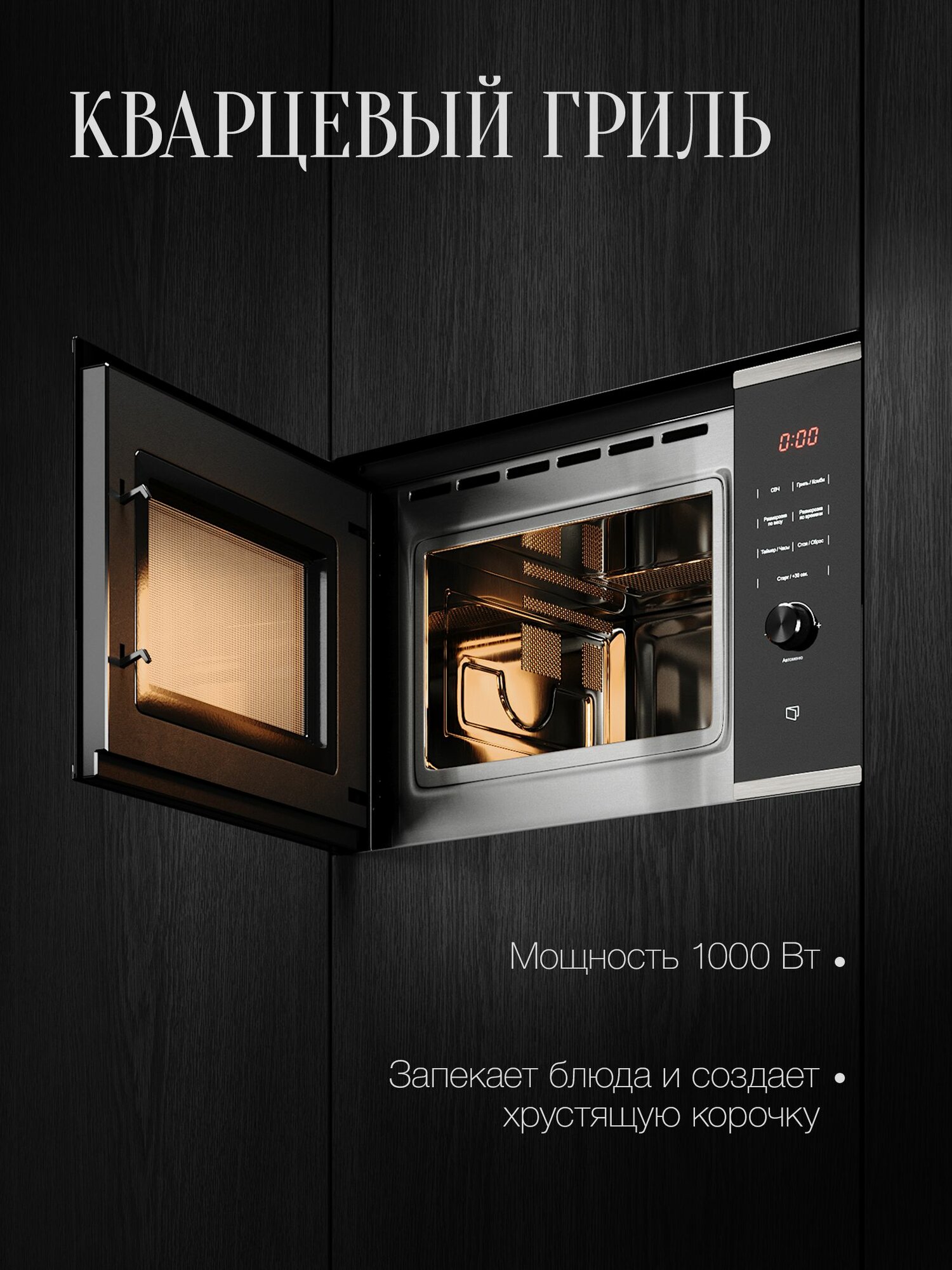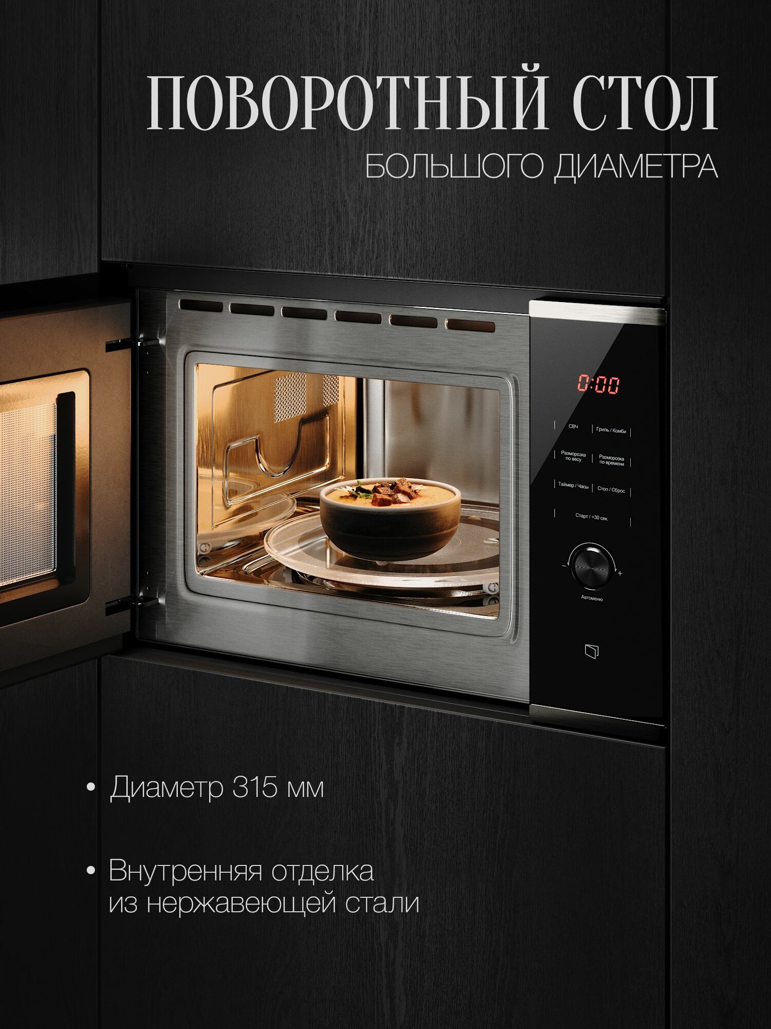 габариты ниши для встраивания (В х Ш х Г), см 38 х 56 х 57; поворотный стол 315 мм, решетка для гриля в комплекте; часы; коллекция: Hi-Tech; таймер многофункциональный; блокировка от детей; мощность подключения: 1450 Вт; размораживание по весу / времени; материал фасада стеклянный, мощность микроволн, Вт 160−900, фурнитура серебристая, комби-режимы