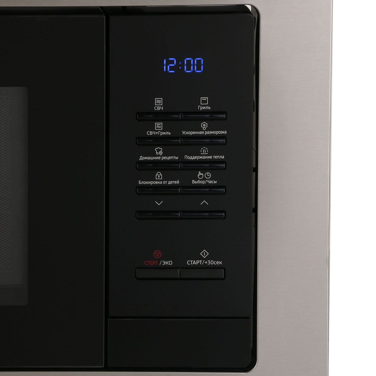 блокировка от детей, дисплей, кнопка +30 секунд, отключение звукового сигнала, подсветка камеры, сенсор пара, Быстрый старт, Внутреннее освещение, Поворотный стол, Поддержание температуры, Режим энергосбережения, С поворотным столом, Часы, автоматическая разморозка, автоматическое приготовление, автоприготовление, звуковой сигнал, поддержание тепла, режим разморозки, функция "домашний десерт" (Home Dessert), часы, эко режим