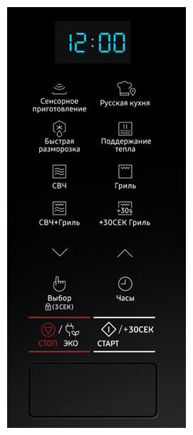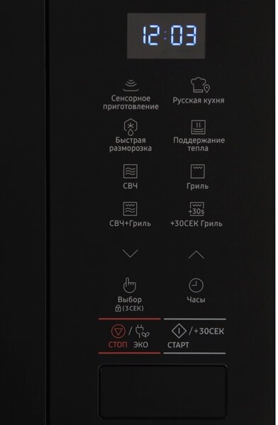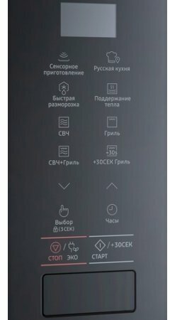 блокировка от детей, дисплей, кнопка +30 секунд, отключение звукового сигнала, подсветка камеры, сенсор пара, система равномерного распределения микроволн, функция задержки пуска, Внутреннее освещение, Защита от перегрева, Поворотный стол, Поддержание температуры, С поворотным столом, Таймер, Часы, ЭКО-режим, автоматическое приготовление, гриль, звуковой сигнал, режим разморозки, часы
