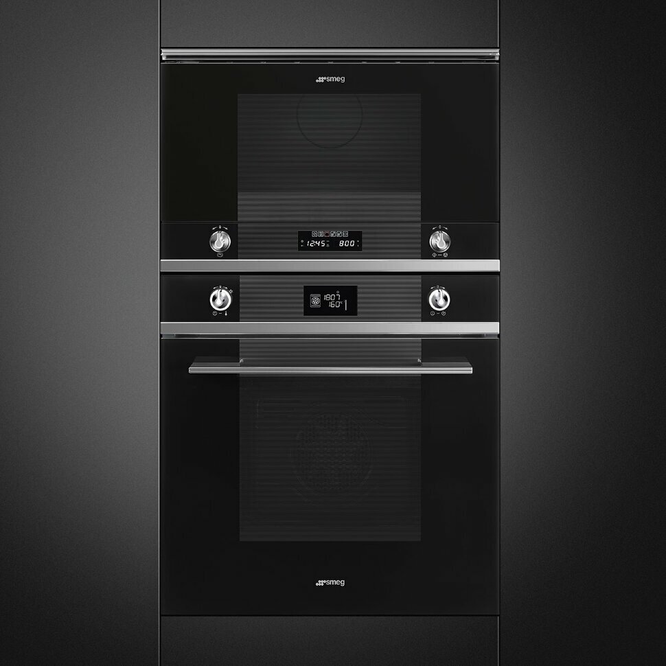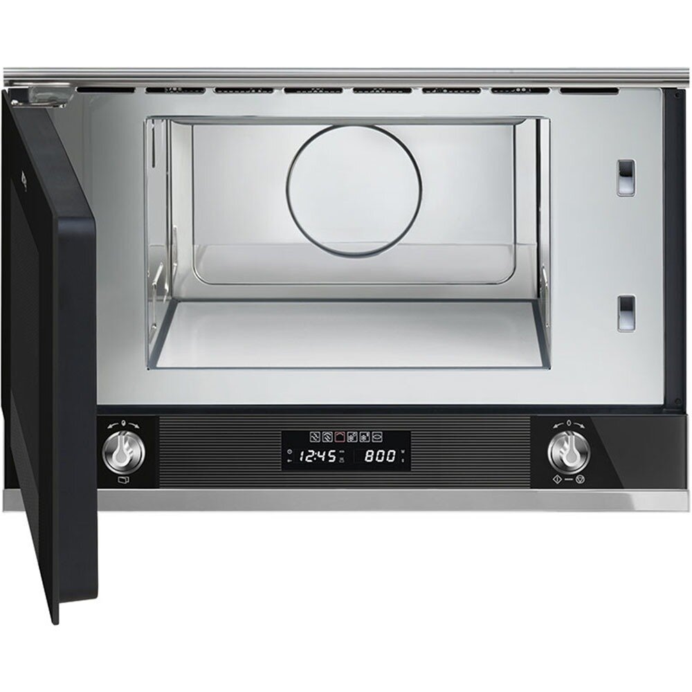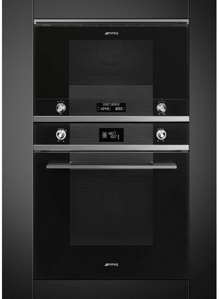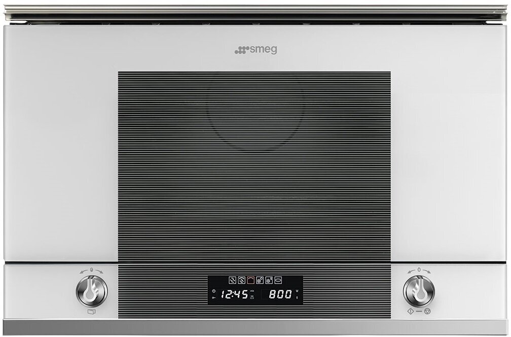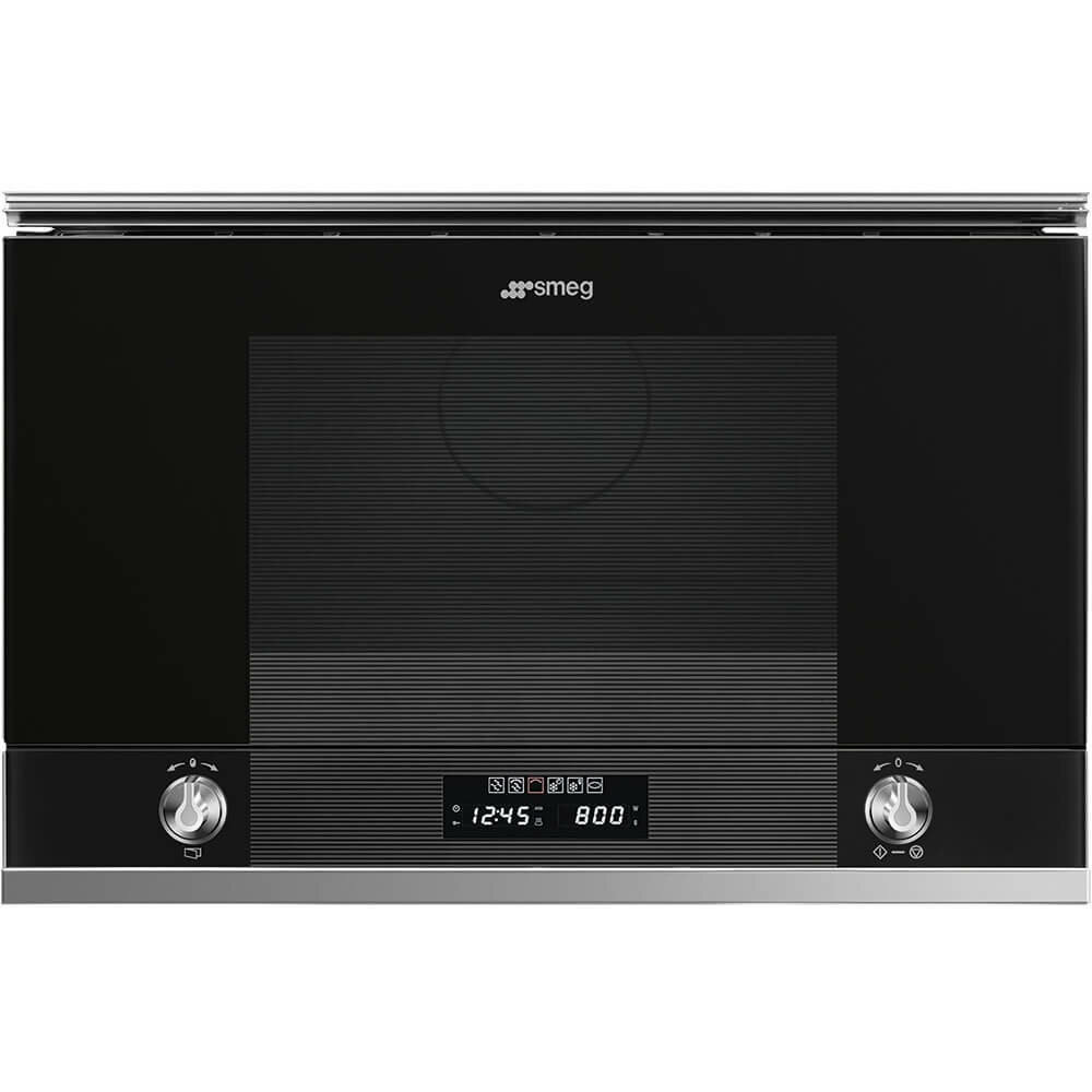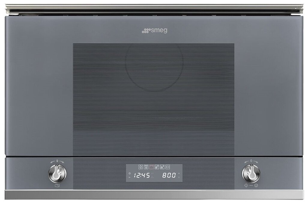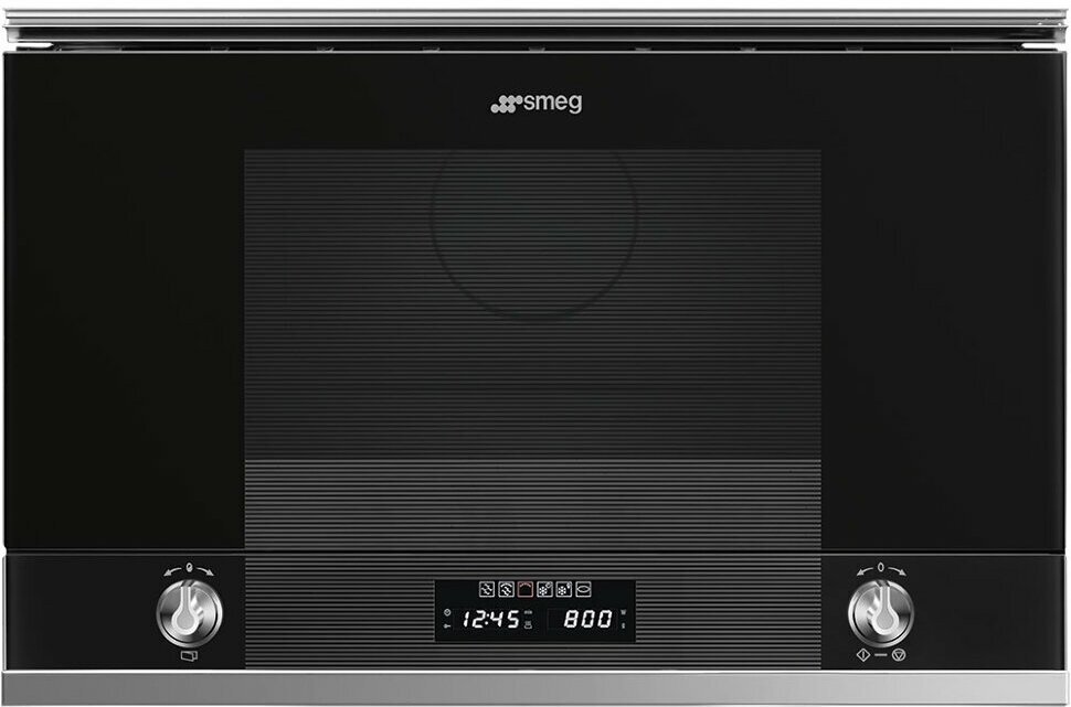 Микроволновая печь Smeg MP122N1 с фасадом из черного стекла. В модели имеется электронный программатор с таймером. Модель из коллекции Linea дополнена фурнитурой цвета нержавеющей стали с двумя LED-дисплеями и двумя поворотными переключателями с подсветкой. Внутренняя камера имеет объем 22 л, изготовлена из нержавеющей стали. Керамическое основание позволяет распространять микроволны по всему объему камеры, так что при приготовлении не нужен поворотный стол. Режимов работы предусматривают готовку при помощи микроволн, откидного гриля, комбинированного режима.