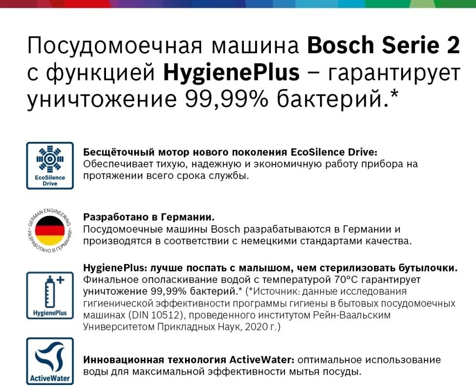 внутренняя поверхность из нержавеющей стали, использование средств 3 в 1, регулируемая по высоте корзина для посуды, сенсор чистоты воды, таймер отсрочки, Serie 2. Гигиена Плюс. ActiveWater. EcoSilence Drive. DosageAssist. Hygiene Plus., Возможность добавления посуды после запуска, Датчик прозрачности воды, Звуковой сигнал, Мытье в верхнем коробе, Отсрочка запуска, Поддон для столовых приборов, Полка для чашек, Регулировка высоты корзин, Самоочищающийся фильтр, Съемные контейнеры для столовых приборов, Таймер, Функция электронного регенерирования, быстрая мойка, интенсивная программа, предварительное ополаскивание/замачивание, экономичная программа