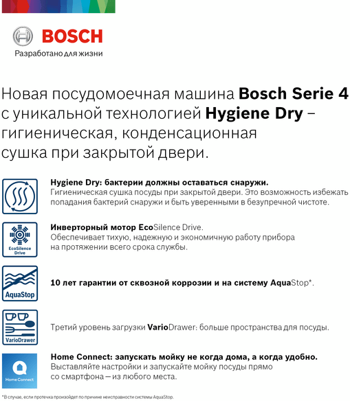 технология Home Connect с поддержкой Яндекс Алисы, голосовое управление с Алисой, специальный отсек DosageAssist в ручке короба, стопоры на передних колесах нижней корзины предотвращают сход корзины с направляющих, режим тихой работы SilenceProgram, технология Hygiene Dry