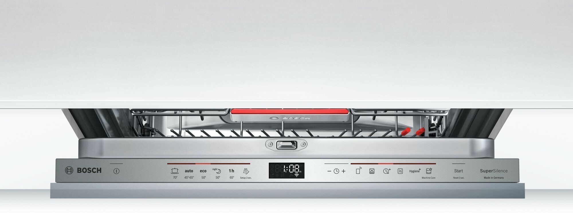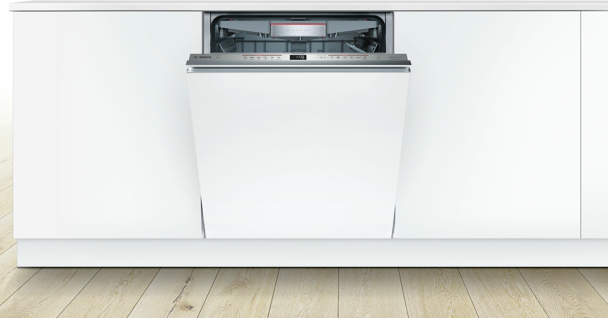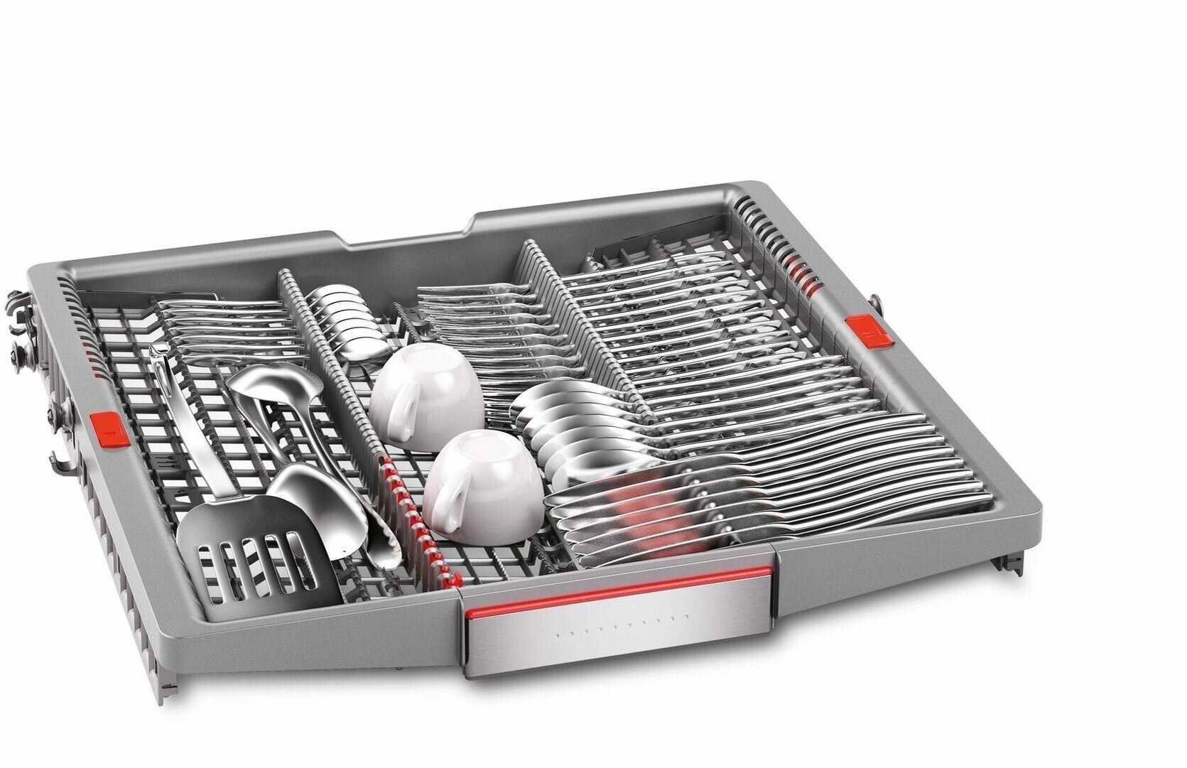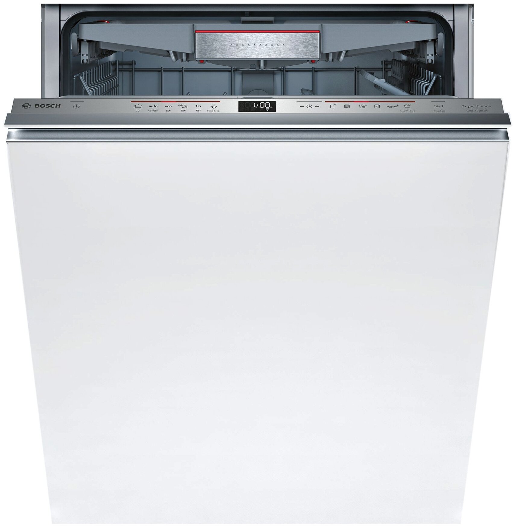 внутренняя поверхность из нержавеющей стали, дисплей, использование средств 3 в 1, регулируемая по высоте корзина для посуды, сенсор чистоты воды, таймер отсрочки, DosageAssist, EcoSilence Drive - тихий и долговечный инверторный мотор нового поколения, IntensiveZone, Serie 6 Home Connect. Удалённый запуск через приложение на смартфоне, VarioSpeed Plus, Гидравлическая система ActiveWater, Отсрочка запуска, Поддон для столовых приборов, Регулировка высоты корзин, индикатор наличия ополаскивателя, индикатор наличия соли, предварительное ополаскивание/замачивание, регулировка жесткости воды, экономичная программа