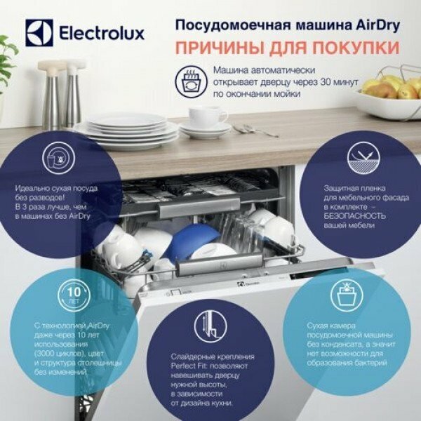 программы мойки: 90 мин, АВТО, ЭКО (4 часа), самоочистка, быстрая 30 минут, предварительное ополаскивание; гибкая система крепления фасадов PerfectFit; функция автоматического открывания AirDry; верхняя корзина с системой FlexiLift; технология QuickSelect - слайдерная панель управления; потребление воды и электроэнергии 9.9 л/0.92 кВт для программы экономичная 50°; давление в водопроводной сети: минимальное 0,5 бар, максимальное 8 бар