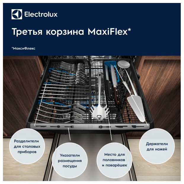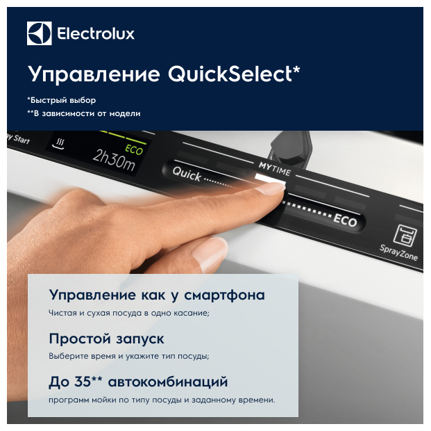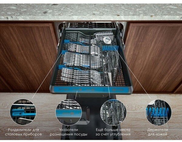 автоматическое открывание дверцы по завершении цикла, дисплей, регулируемая по высоте корзина для посуды, таймер отсрочки, авто-открывание дверцы, быстрая мойка, индикатор наличия ополаскивателя, индикатор наличия соли, предварительное ополаскивание/замачивание, самоочистка фильтра, экономичная программа
