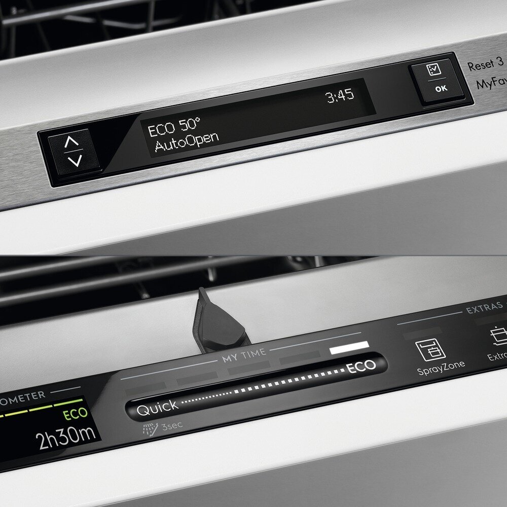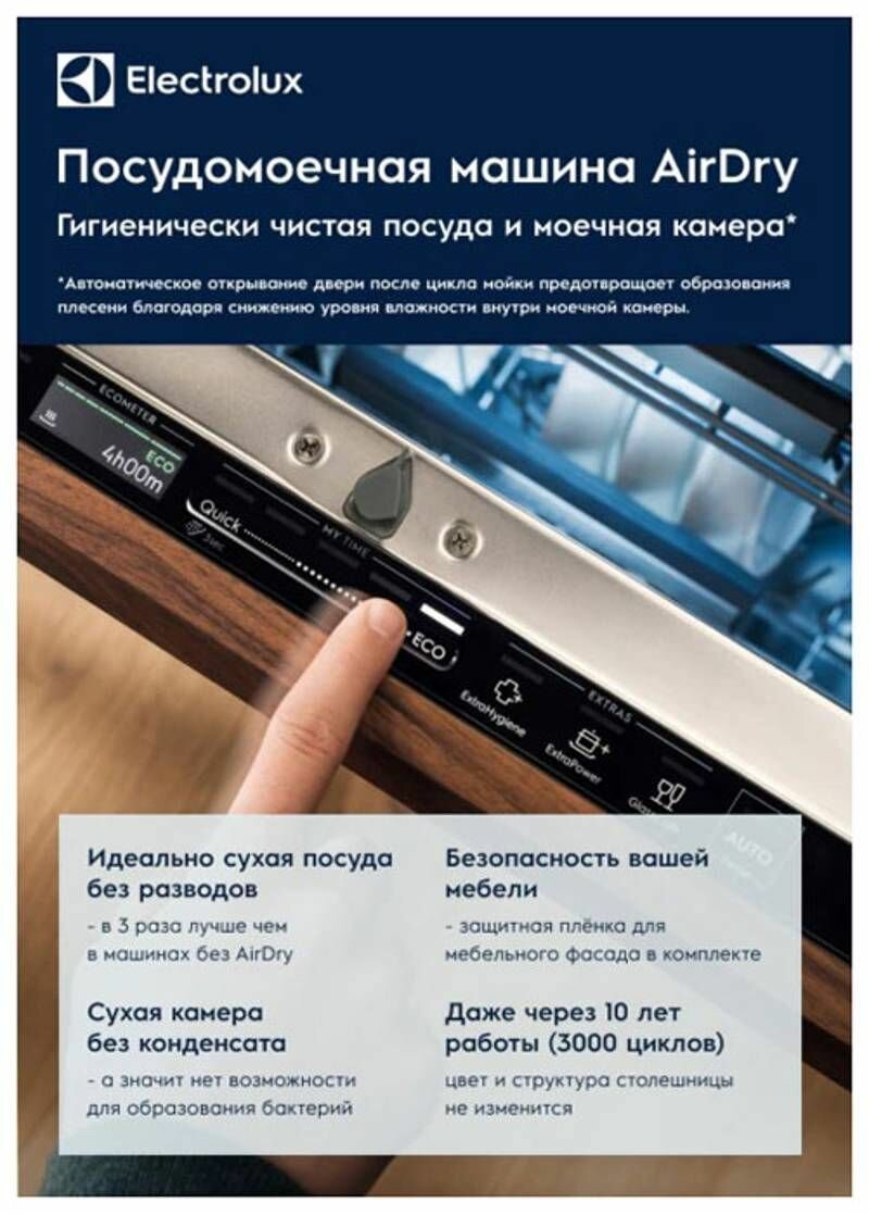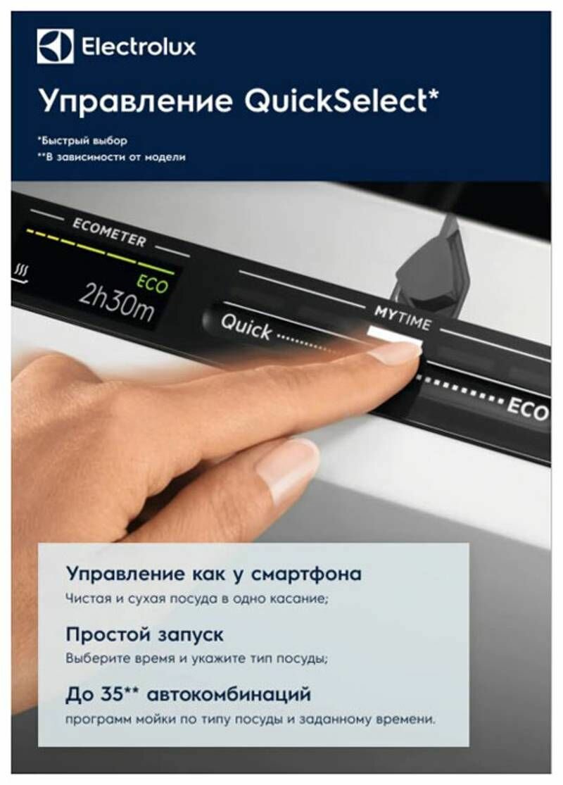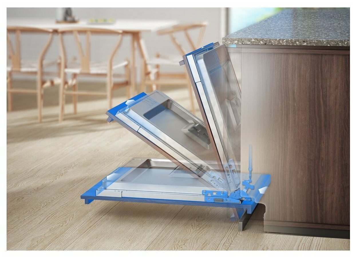 программы мойки: 160 минут, 60 минут, 90 мин, АВТО, ЭКО (4 часа), самоочистка, быстрая 30 минут, предварительное ополаскивание; гибкая система крепления фасадов PerfectFit; функция автоматического открывания AirDry; слайдерное управление QuickSelect; верхняя корзина с системой FlexiLift; давление в водопроводной сети: минимальное 0,5 бар, максимальное 8 бар; потребляемая мощность в спящем режиме 5 Вт