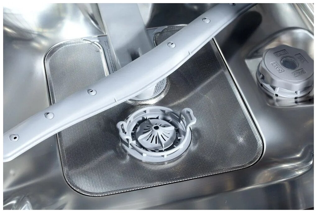 самоочистка фильтров; размеры ниши для встраивания: 82 х 60 х 56 см; потребляемая мощность в режиме ожидания: 0,49 Вт, в выключенном состоянии: 0,45 Вт; 5 уровней разбрызгивания воды; в комплекте: складные держатели тарелок