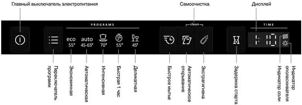 наличия ополаскивателя, наличия соли, Луч на полу (окончание цикла работы), Ход программ