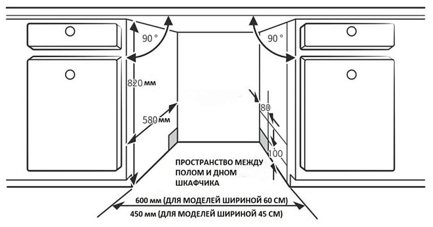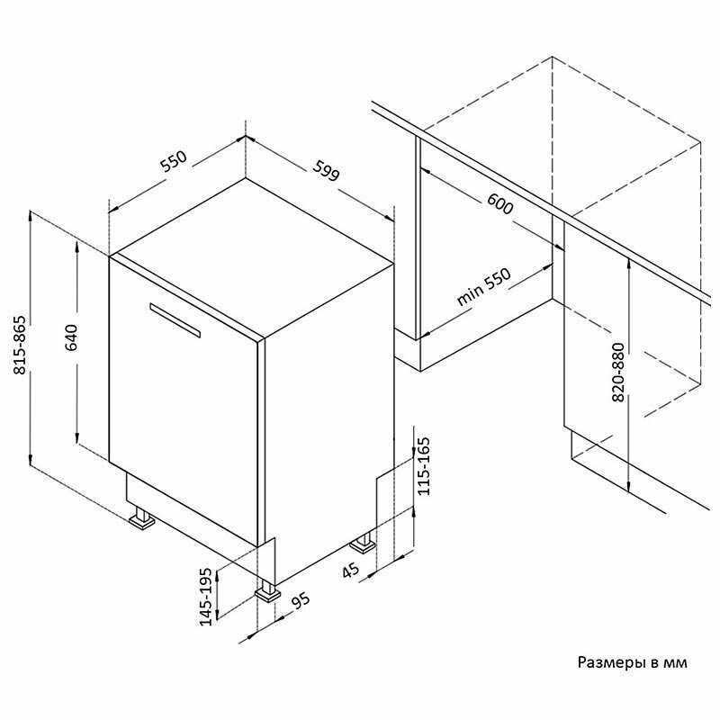 длина заливного шланга 1.83 м, длина сливного шланга 1.6 м; длина шнура питания 1.5 м; размеры встраивания (ВxШхГ) 820-880x600х580 мм