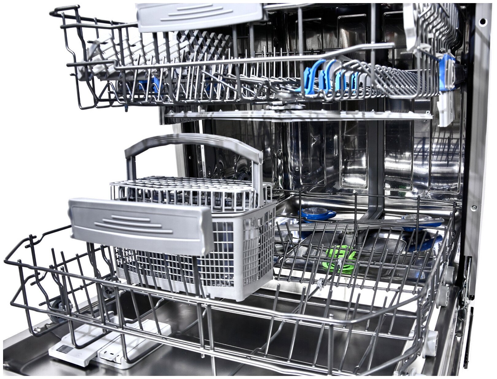 автоматическая установка жесткости воды, внутренняя поверхность из нержавеющей стали, дисплей, использование средств 3 в 1, обработка против отпечатков пальцев, регулируемая по высоте корзина для посуды, сенсор чистоты воды, таймер отсрочки, Датчик прозрачности воды, Звуковой сигнал, Мытье в верхнем коробе, Отсрочка запуска, Поддон для столовых приборов, Полка для чашек, Половинная загрузка, Регулировка высоты корзин, Съемные контейнеры для столовых приборов, Таймер, индикатор наличия ополаскивателя, индикатор наличия соли