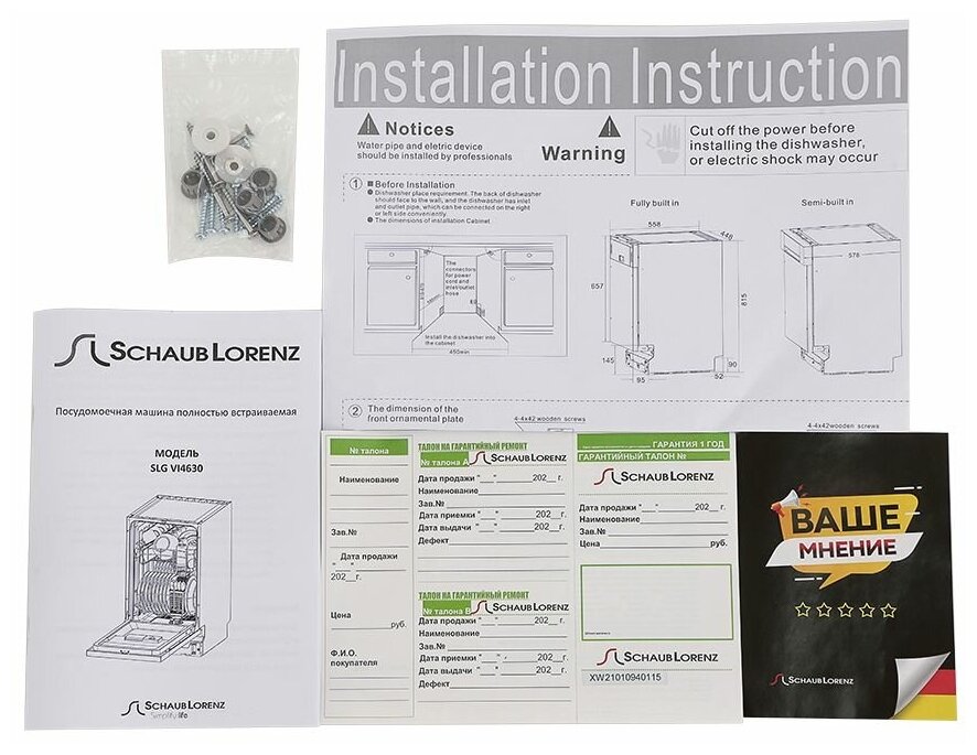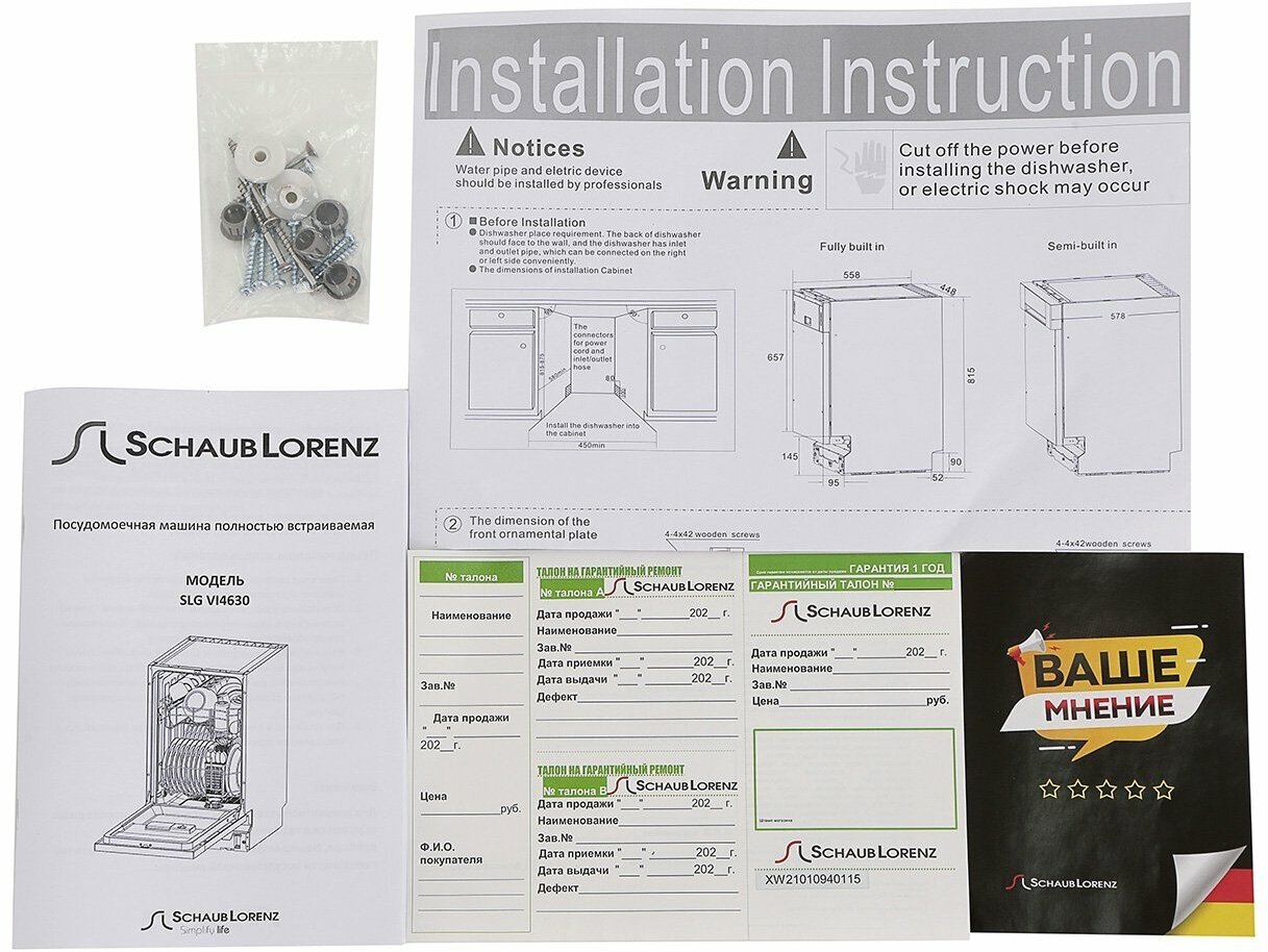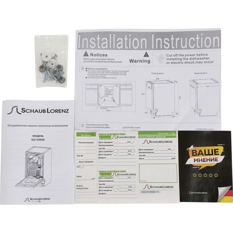 корзина для столовых приборов, Воронка для засыпки соли, Гарантийный талон, Лоток для столовых приборов, Пластиковый держатель для сливного шланга, Руководство по эксплуатации, Сливной шланг, лоток для столовых приборов