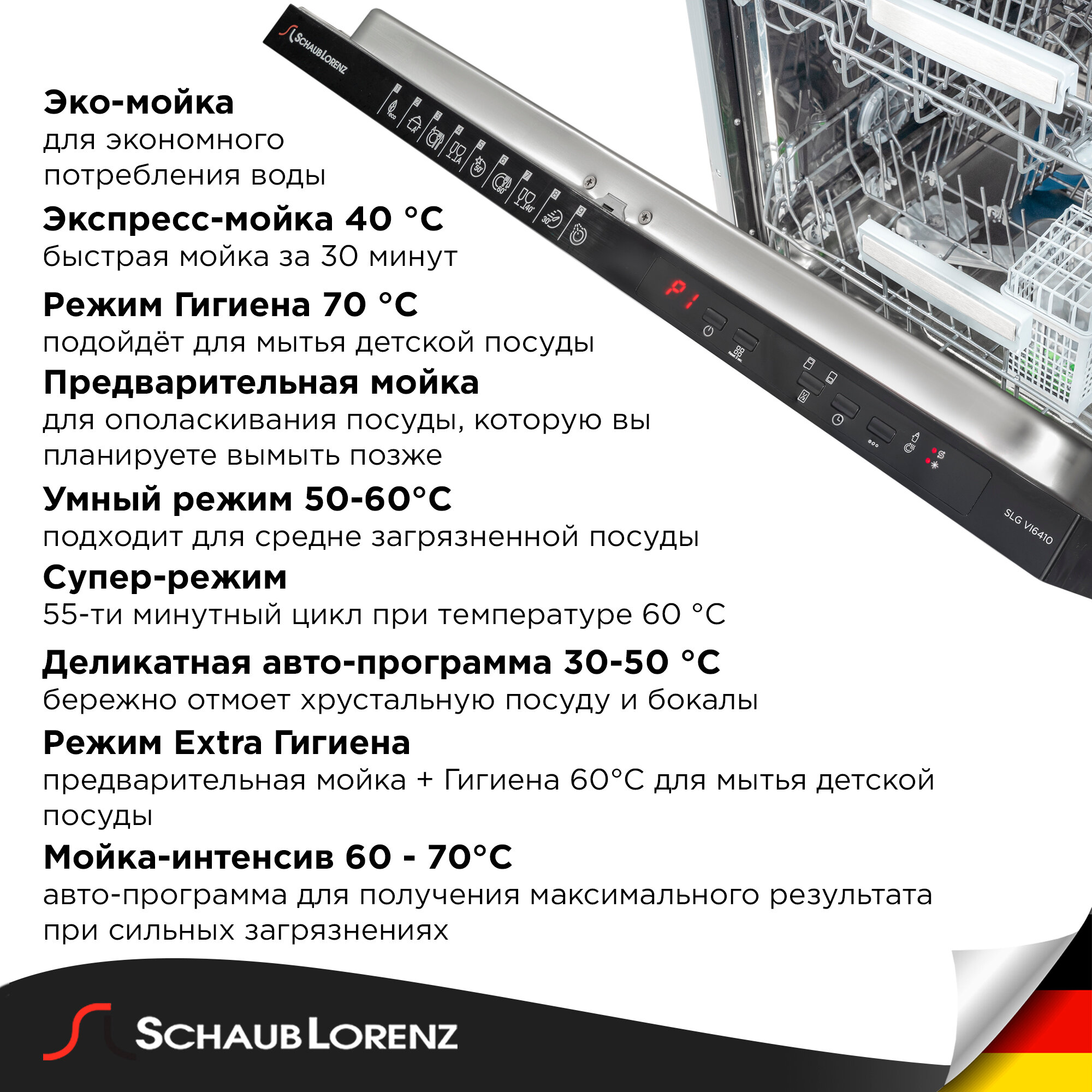 автоматическая установка жесткости воды, внутренняя поверхность из нержавеющей стали, дисплей, использование средств 3 в 1, обработка против отпечатков пальцев, подсветка камеры, регулируемая по высоте корзина для посуды, сенсор чистоты воды, таймер отсрочки, Датчик прозрачности воды, Звуковой сигнал, Мытье в верхнем коробе, Отсрочка запуска, Поддон для столовых приборов, Полка для чашек, Половинная загрузка, Регулировка высоты корзин, Съемные контейнеры для столовых приборов