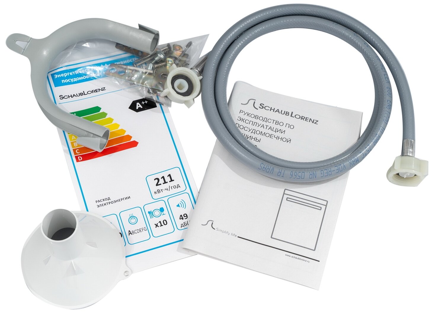 держатель для бокалов, корзина для столовых приборов, Воронка для засыпки соли, Лоток для столовых приборов, Пластиковый держатель для сливного шланга, Посудомойка, Посудомойка, документация, Руководство по эксплуатации, Сливной шланг, держатель для бокалов, корзина для столовых приборов, документация, лоток для столовых приборов