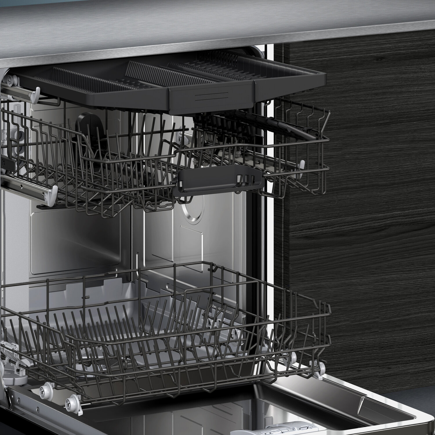 система: RackMatic, Vario Speed Plus,VarioDrawer, самоочищающаяся фильтрующая система; глубина с открытой дверью на 90 градусов: 1150 мм; размеры ниши для встраивания: 81.5-87.5 х 60-60.8 х 55 см; звуковое предупреждение об окончании программы