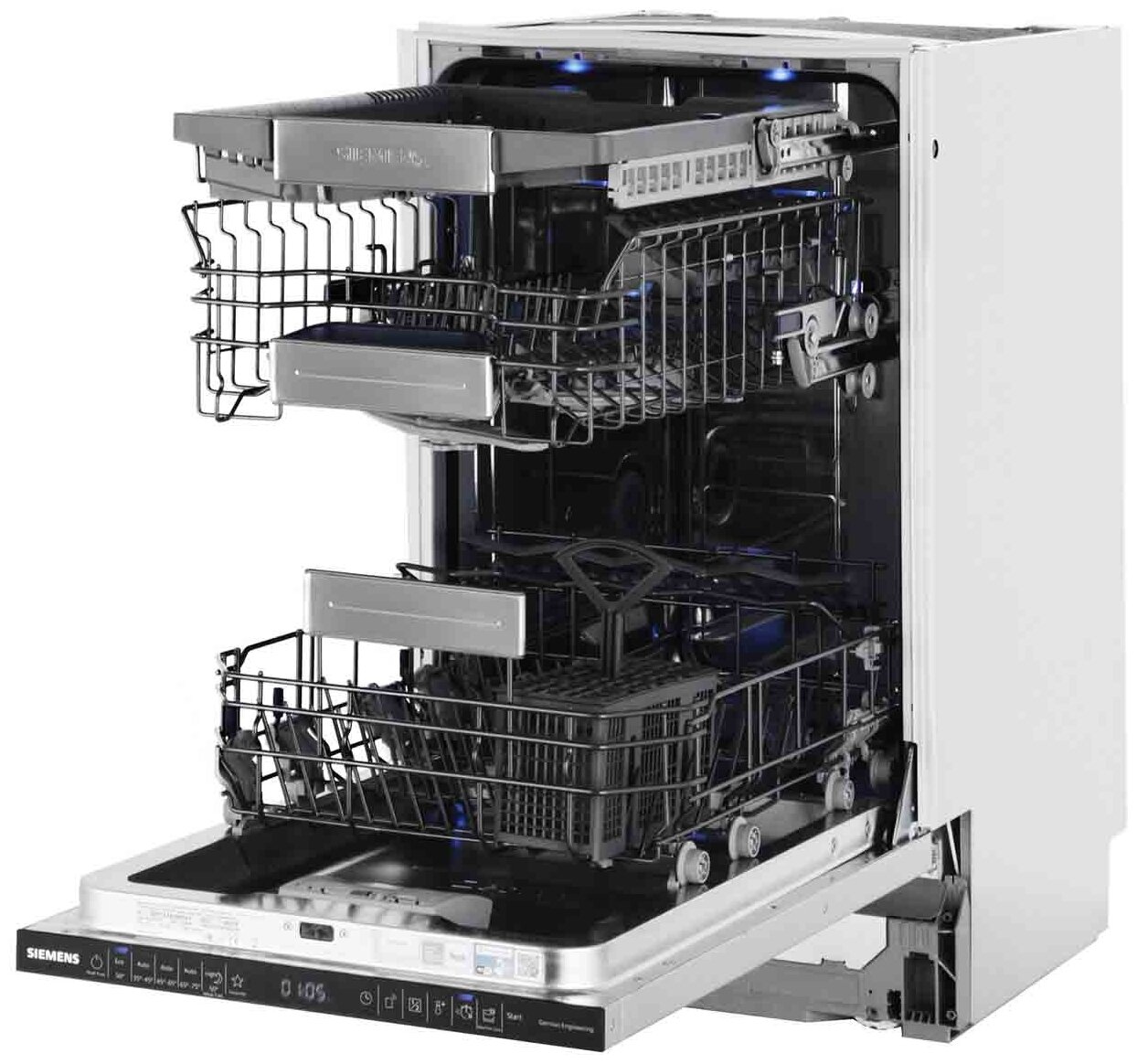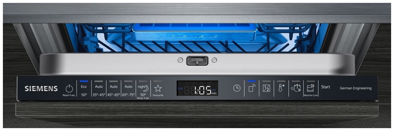 внутренняя поверхность из нержавеющей стали, дисплей, использование средств 3 в 1, открывание без ручки, подсветка камеры, проточный водонагреватель, регулируемая по высоте корзина для посуды, сенсор чистоты воды, таймер отсрочки, деликатная мойка, индикатор наличия ополаскивателя, индикатор наличия соли, экономичная программа